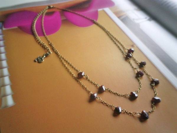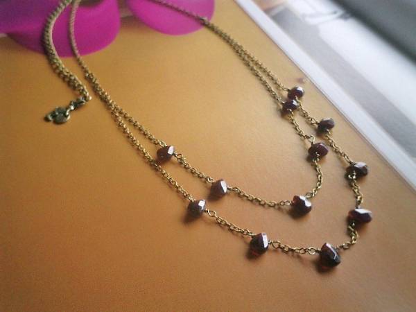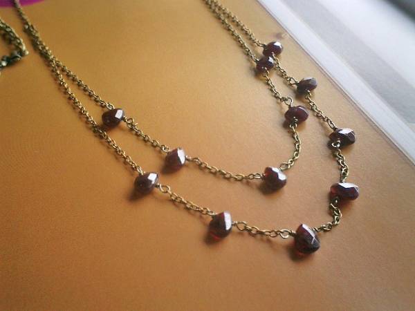ロマンチズム紀行・・シリーズです♪恋心紡いで・・シックな深い赤のガーネットの2連のネックレスです♪5ミリ位の丸玉と6×9ミリ位のフラットカットシェイプのガーネットを繊細なチェーンでランダムにつないでいます♪シンプルで合わせやすいデザインです♪♪長さは50センチ+アジャスター13センチで最長63センチ位です♪♪お揃いのブレスレットも出品予定です♪ハンドメイドをご理解頂いてノークレーム、ノーリターンでお願いします