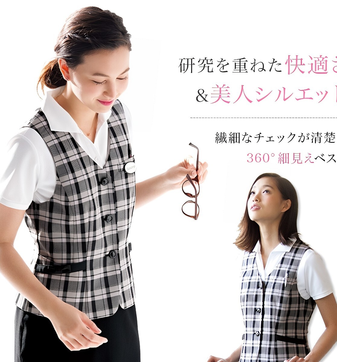 名札専用ミニポケット、インク漏れ防止胸ポケット、印鑑ポケット付き、右脇二重ポケット、バックスタイルはサイズ調整できる背ベルト付き
