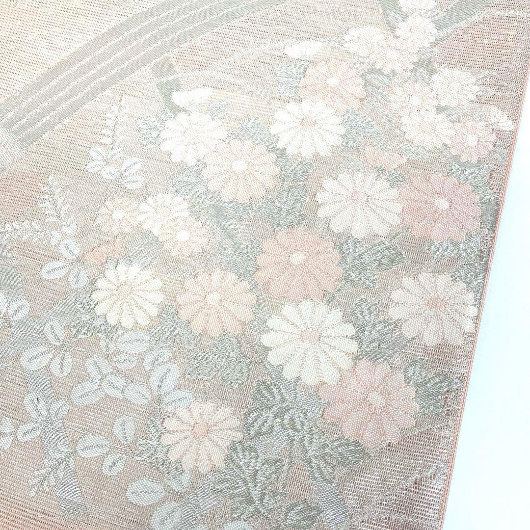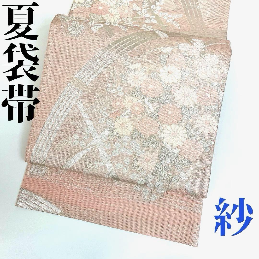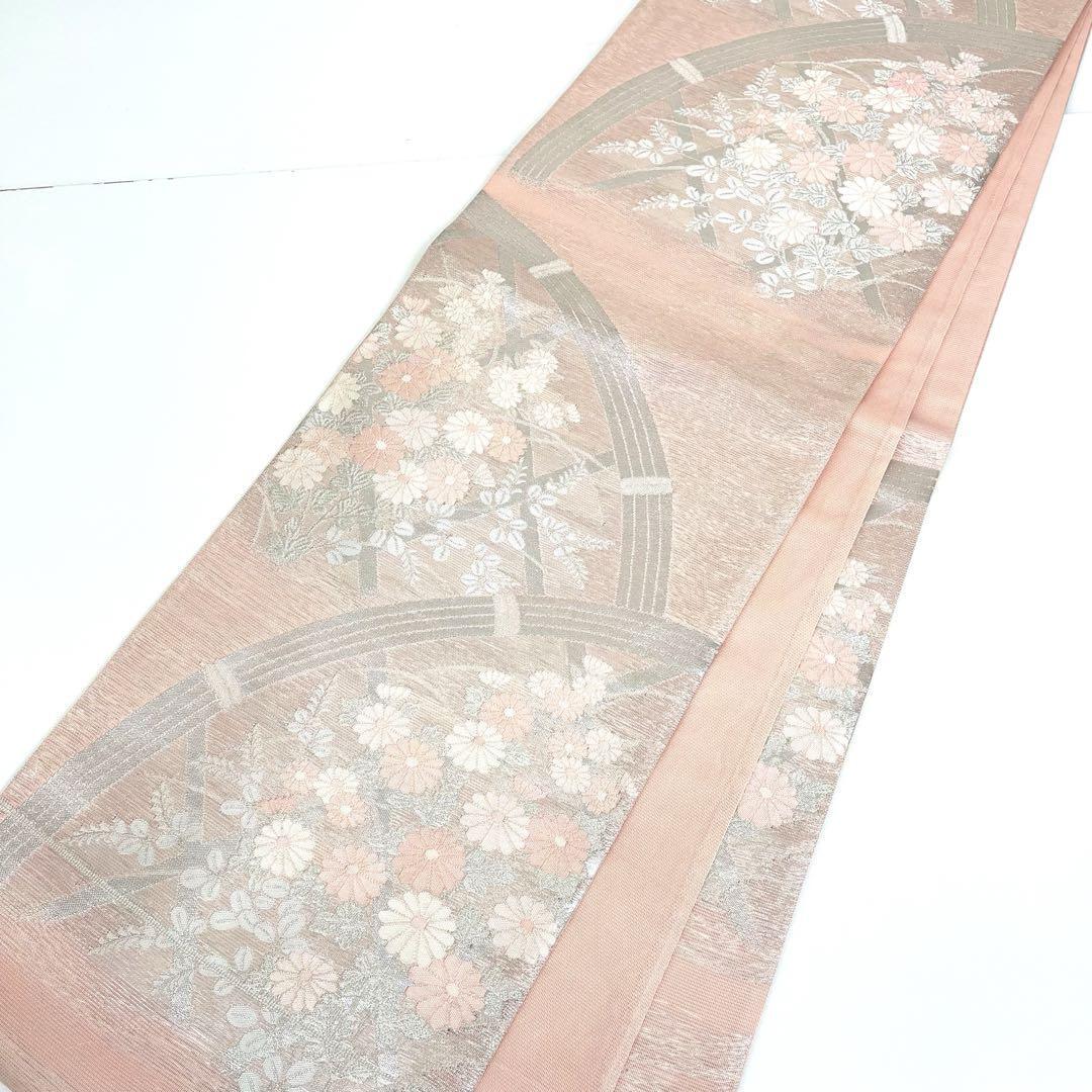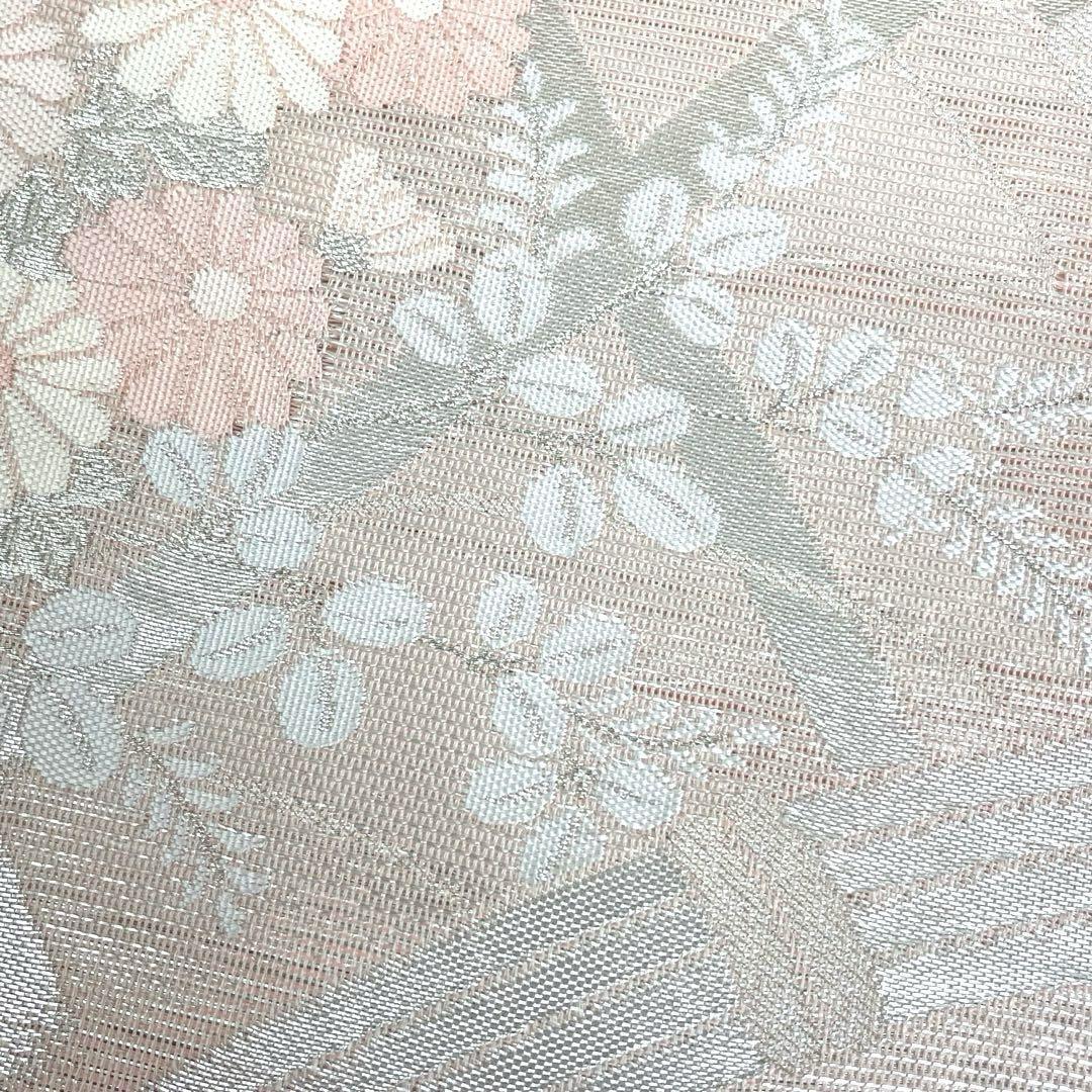 やわらかなピンク系の地色に、繊細な花々が織り出された紗の夏袋帯です。