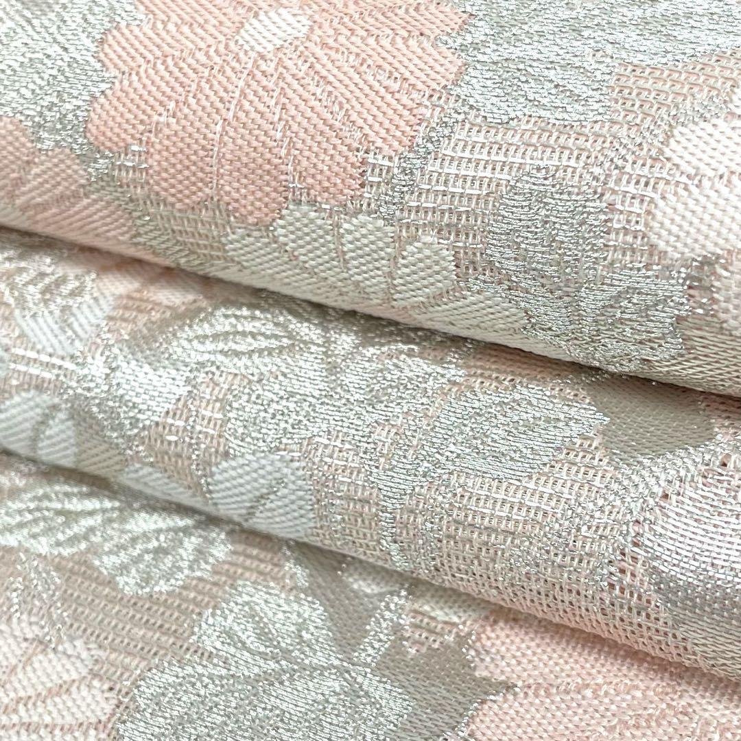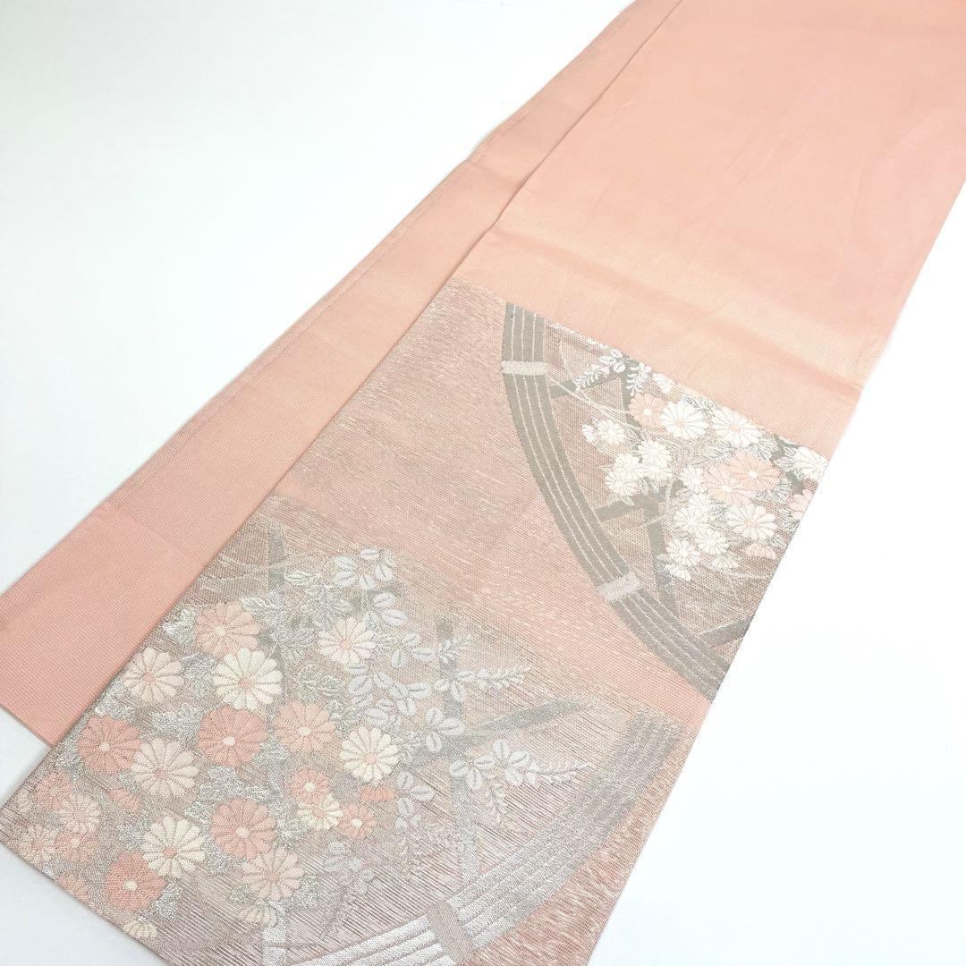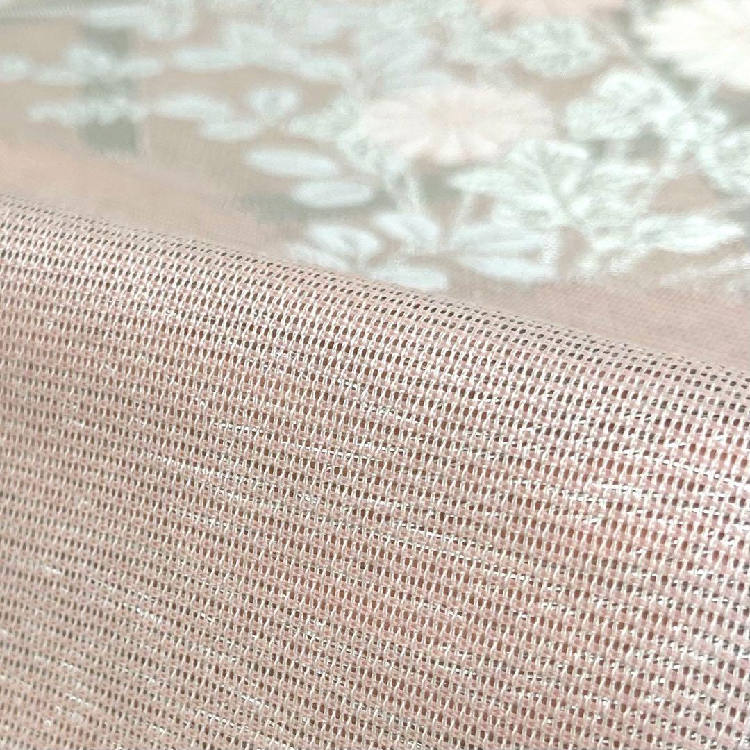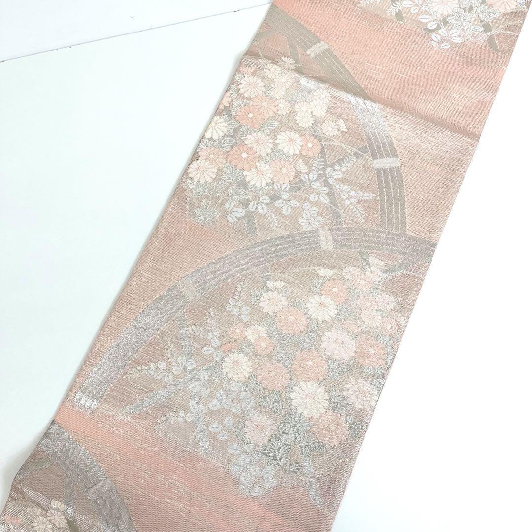 やわらかなピンク系の地色に、繊細な花々が織り出された紗の夏袋帯です。