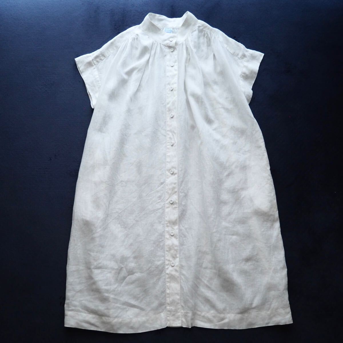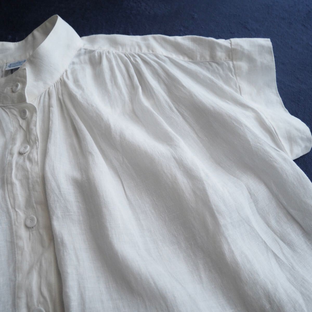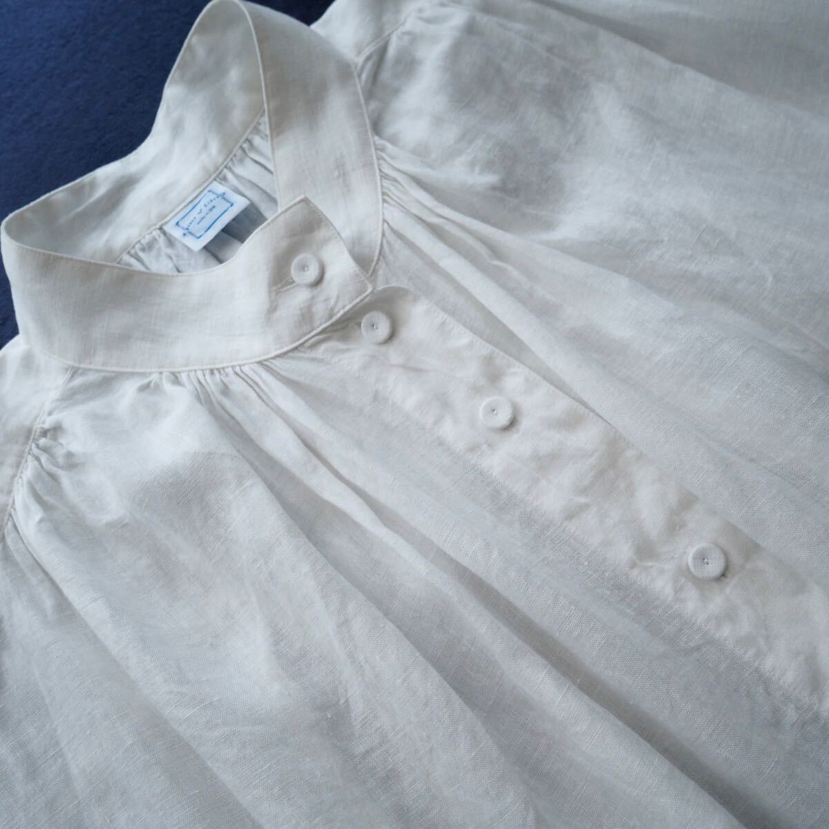 バンドカラーの襟元と、所々に入ったギャザーがナチュラルで可愛い一着です。