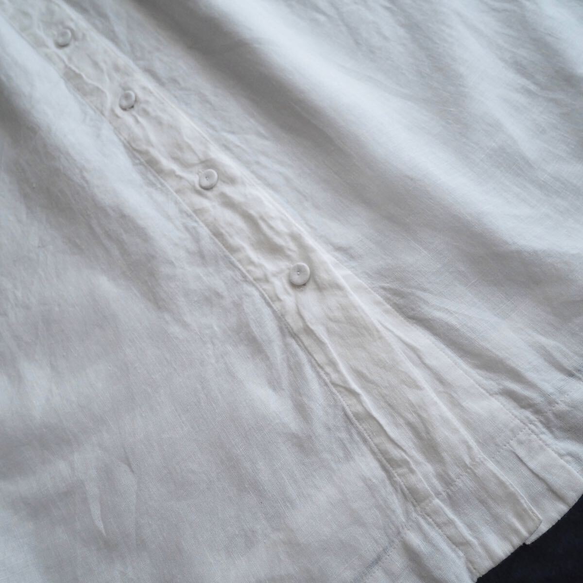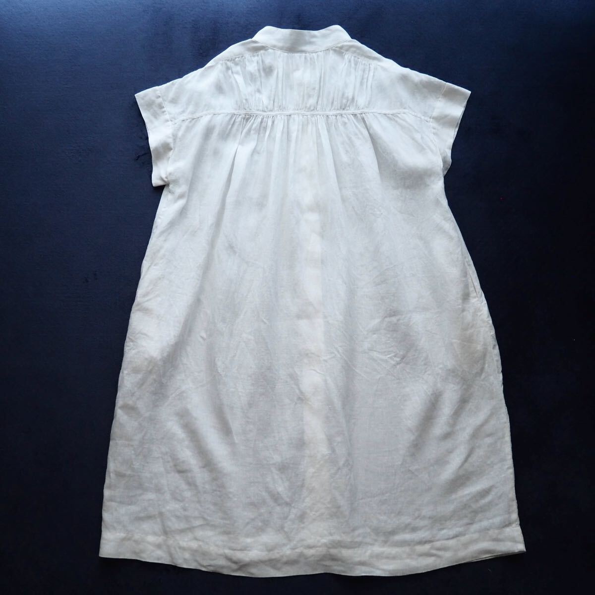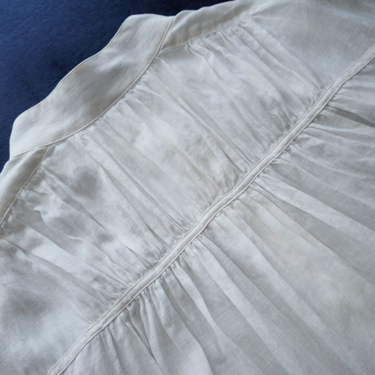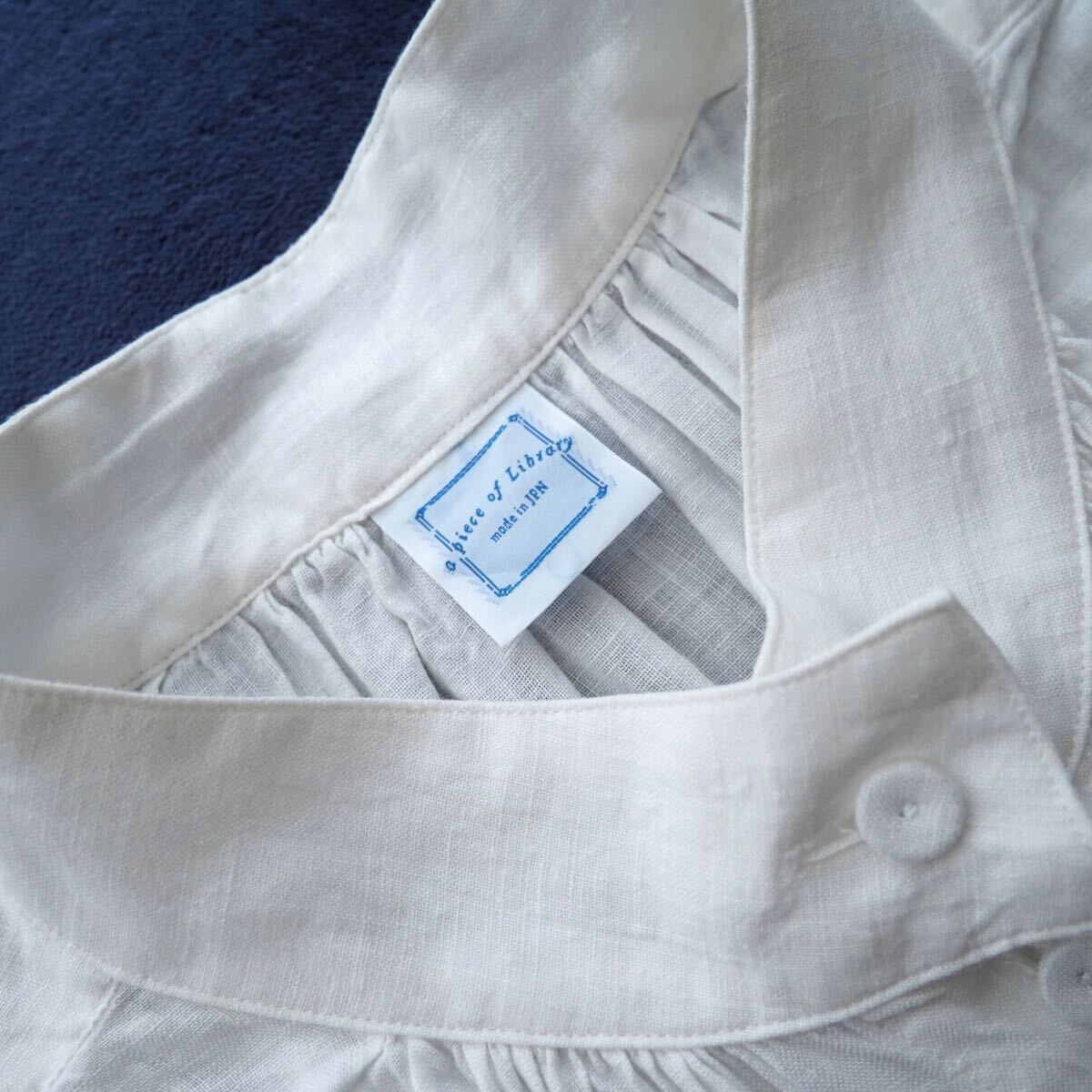 バンドカラーの襟元と、所々に入ったギャザーがナチュラルで可愛い一着です。