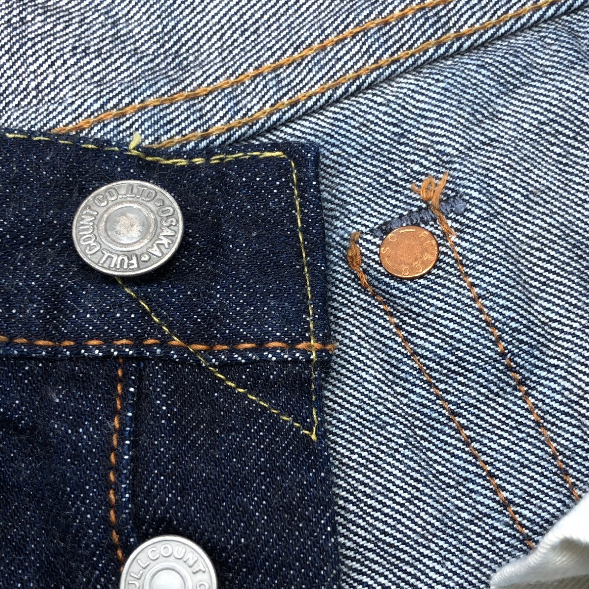 備考:ボタンフライ セルビッチ(ピンク耳) 裾チェーンステッチ 三角ステッチ 隠しリベット