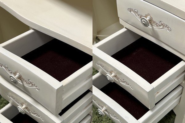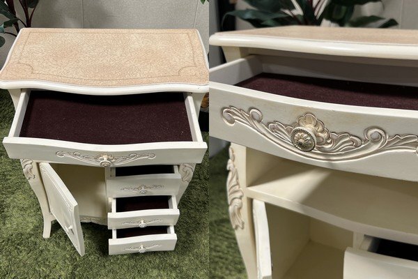 猫脚、手彫り仕上げ、引出し内部の底のフェルト加工など、