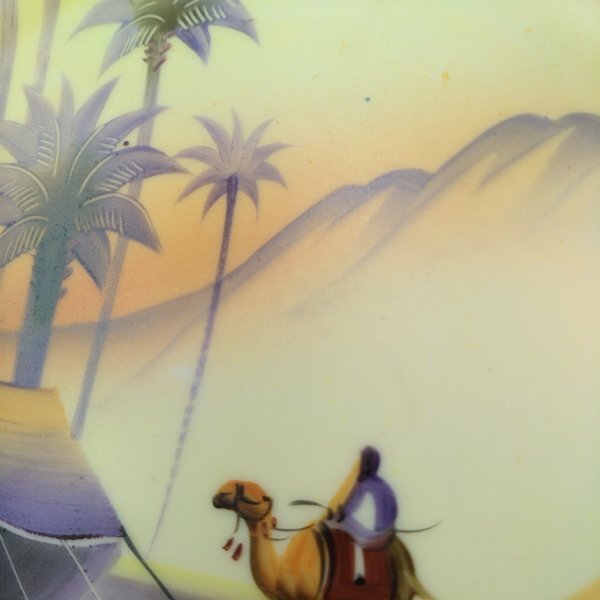 中央には、砂漠のテントやヤシの木、らくだに乗る紳士の姿が柔らかなタッチで手描きされており、当時の欧米市場向けデザインに見られるエキゾチックな趣が存分に表現されています。