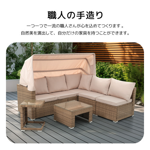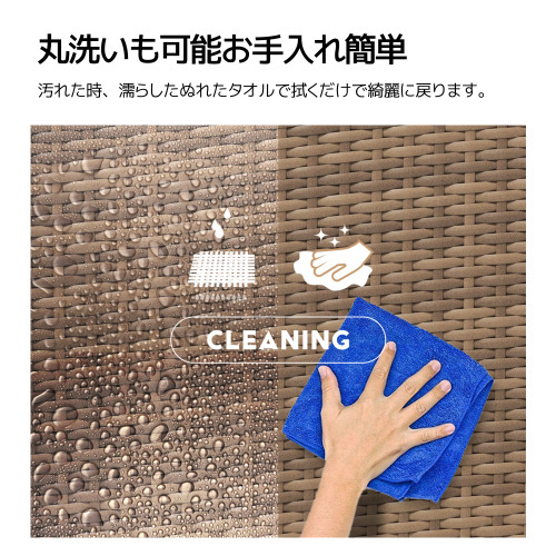 人工ラタン製は高密度HDPE + LDPE(非常に耐久性の強い次世代の新素材)を使用し高い耐候性を持つため、紫外線や雨、風の強い天候下、また乾燥した場所にも強くほとんど色落ちしないです。