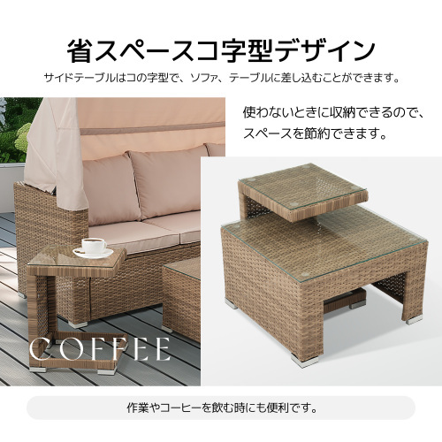 サイドテーブルはコの字型で、ソファ、テーブルに差し込むことができます。作業やコーヒーを飲む時にも便利です。