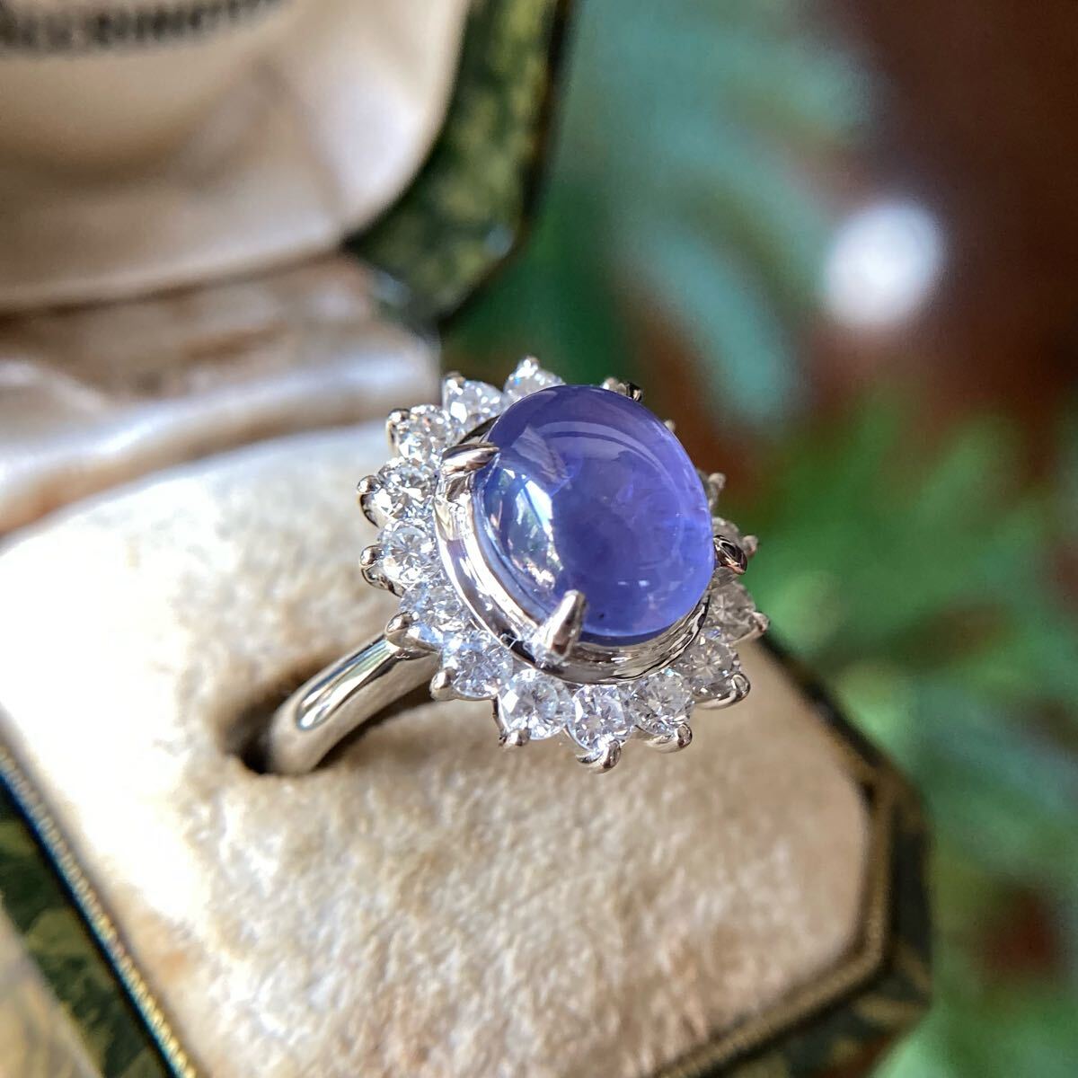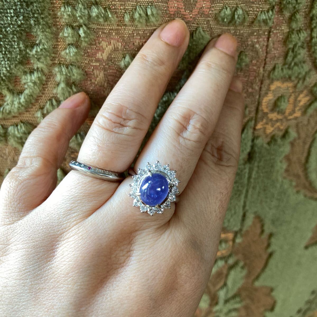 非加熱ならではのシルクインクルージョンが、光を受けてさりげなくきらめき、手元にふとした魔法を添えるかのよう。ダイヤモンドの取り巻きとともに、上品な存在感を放つ逸品です。