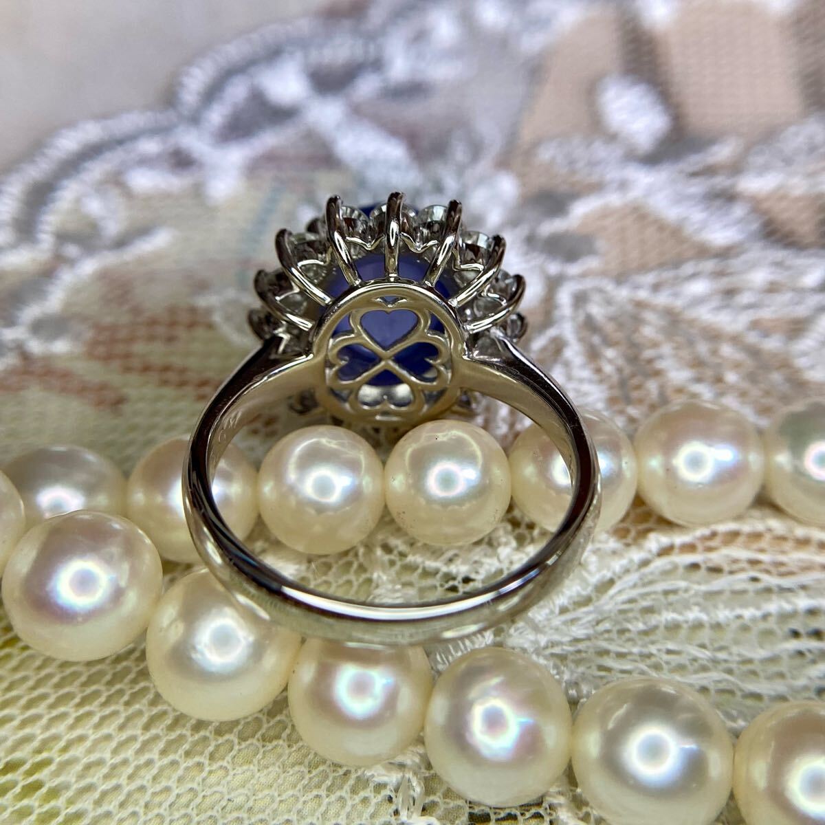 また、裏側の作りにもこだわりが光ります。石座の下には、ハートが4つ寄り添った四つ葉のクローバーのようなデザインが施されており、見えないところにも愛らしさと職人の粋が込められています。