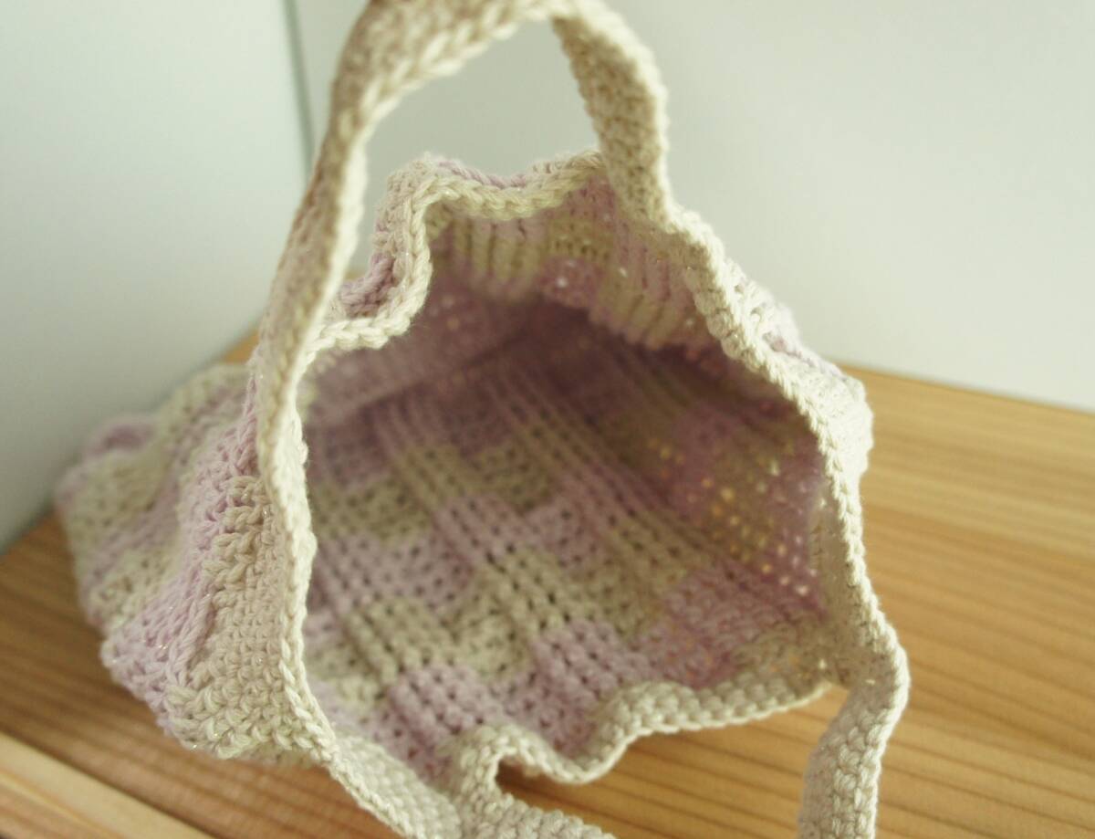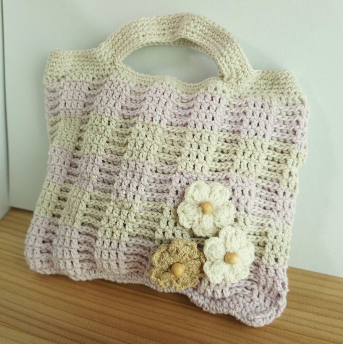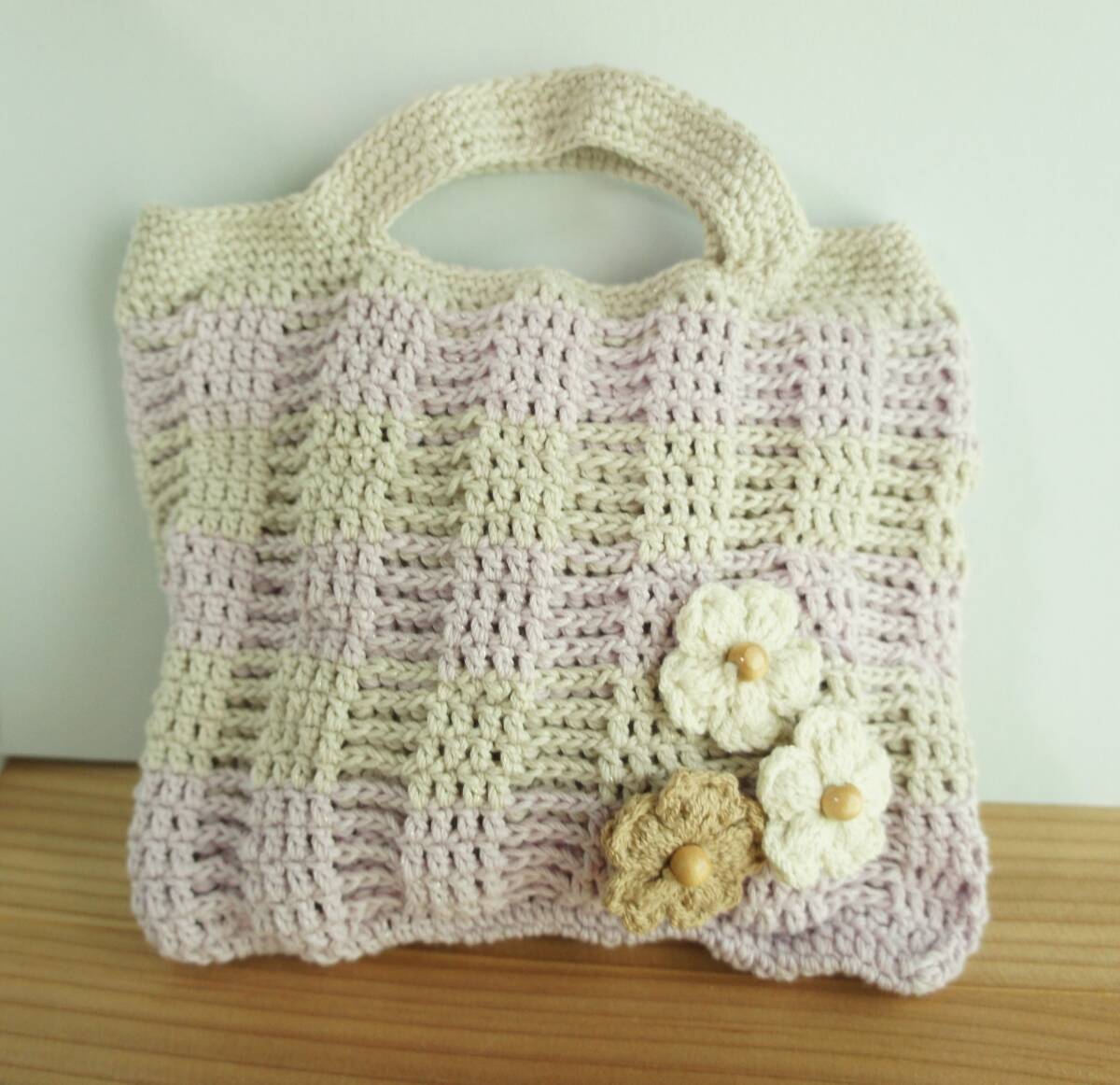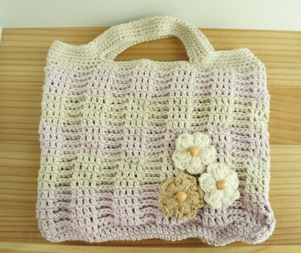 ハンドメイド トートバッグ かぎ針編み 手編み ストライプ パープル ベージュ ラメ入り ブラウン オフホワイトのお花 ウッドビーズ付き