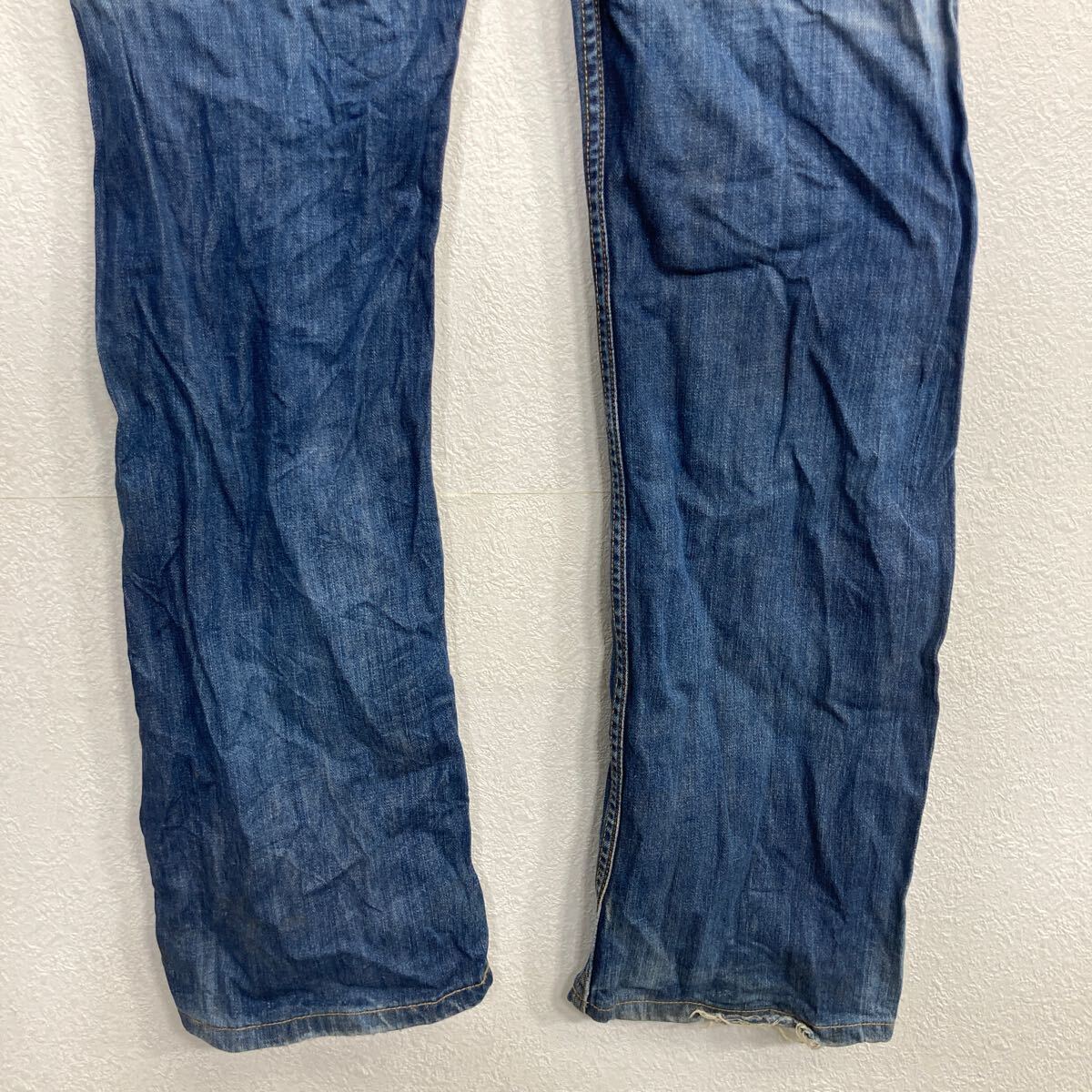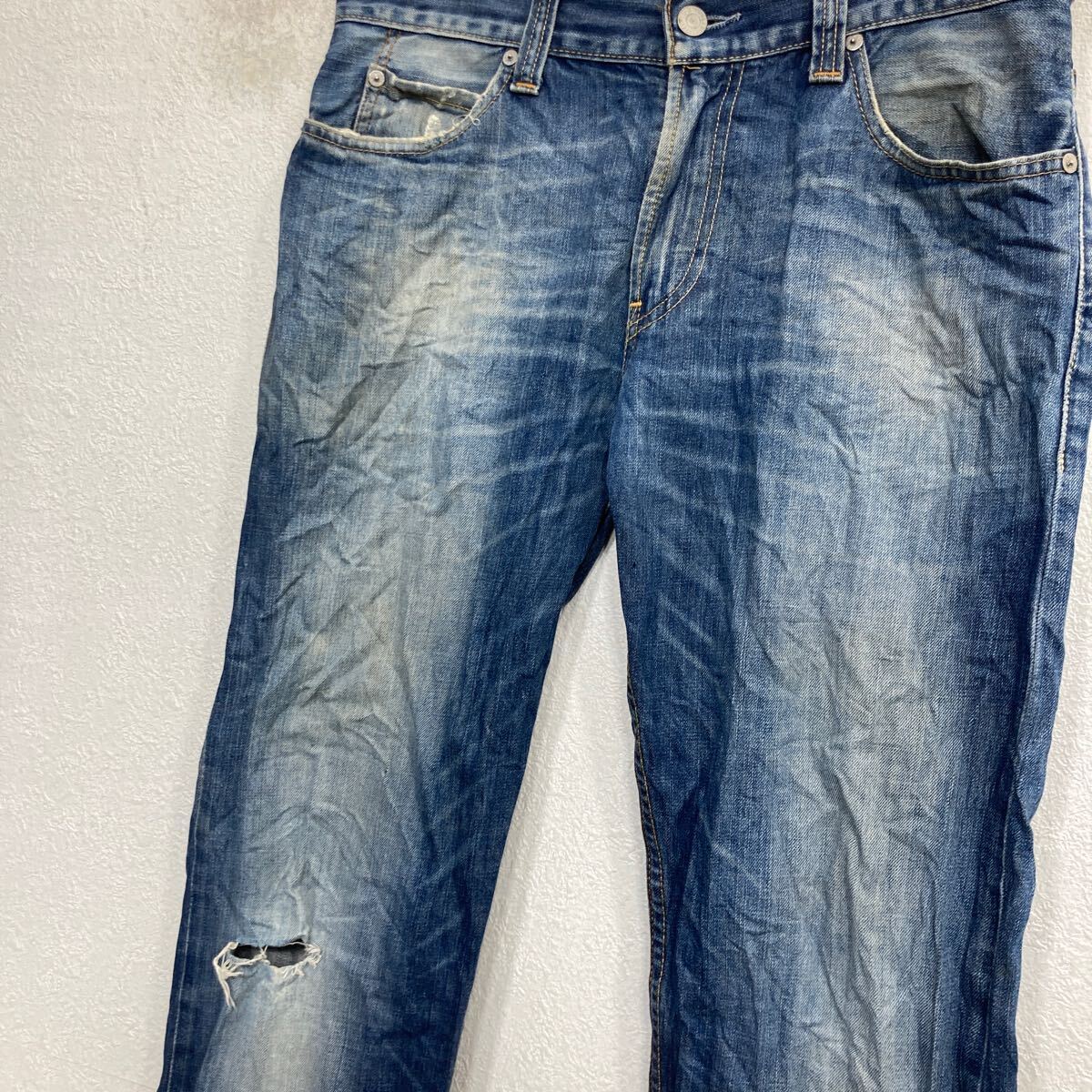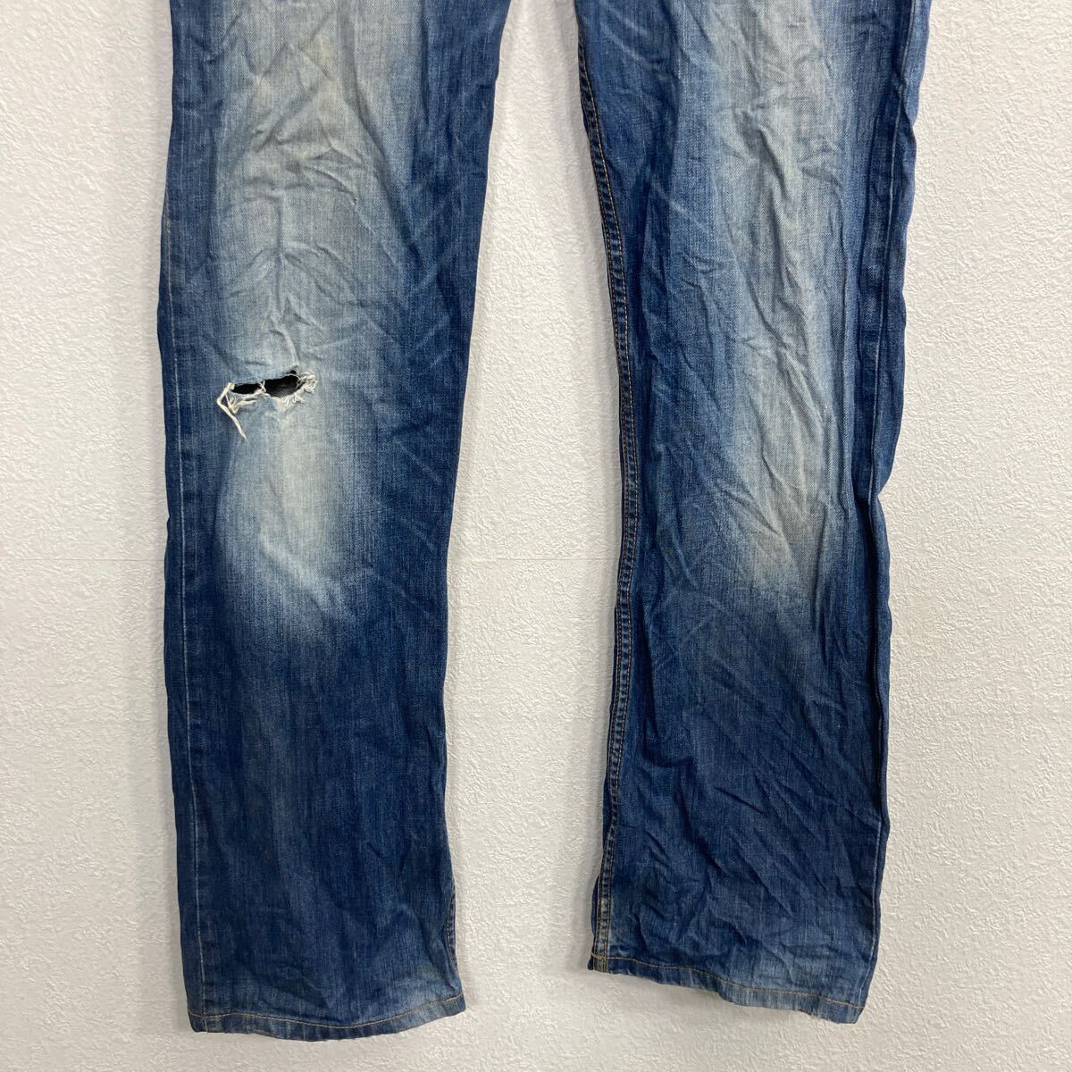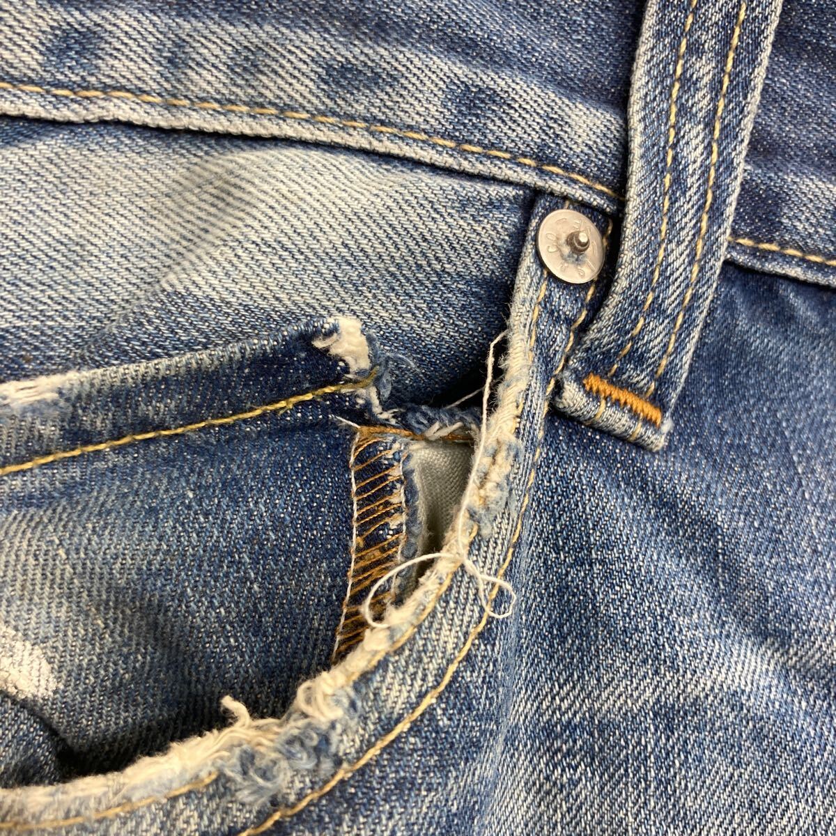 フロント右ポケット、コインポケット、膝、両裾にダメージがあります。