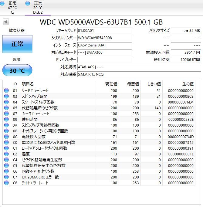【東芝・換装用HDD 500GB☆交換/修理】WDC WD5000AVDS-63U7B1 500GB 【状態について】 USED品ですので、使用感のあるお品になります。 多少の傷や汚れがございます。 状態を含め、付属品、全て掲載画像を参考にご検討お願いいたします。 出品にあたり、以下の動作を確認しました。 動作確認事項 ◇HDDの健康状態は正常です。 ◇対応機種:RD-BR600/RD-BR610/RD-BZ700/RD-BZ710 ◇その他の対応機種はご質問下さい。 ※ HDD交換後に、本体でフォーマットを実行してご使用ください。 中古品ですので、ご理解のある方のみご落札下さい。 本体に、汚れや傷等があります。 【発送について】 ・宅急便コンパクト(全国一律600円、ただし、沖縄はレターパックプラス)になります。 PT5040 注意事項 ◆入札した時点で、すべての記載事項をご理解いただき、同意なさったものとみなします。 ◆評価が「新規」「マイナス」の方の入札は、無条件で削除いたします。 ◆悪い評価が多い方の入札は、こちらの判断で削除する場合があります。 ◆落札後のキャンセルは、悪い評価になりますので注意下さい。 ◆オークション終了後、24時間以内に連絡をいただけない場合は、落札者都合で削除いたします。 ◆オークション終了後、72時間以内に送金手続きが完了できる方のみ、ご入札をお願いいたします。 ◆商品到着日から1週間の初期動作保証いたします。 保証内容はHDDが認識しない/Cryctaldiskinfoで正常以外の判定 □コメント ★外観(キズ・汚れ)や詳細(型番・付属品等)について、可能な限りわかりやすく撮影しておりますので、 入札前に必ずご確認下さい。 ★ノークレーム、ノーリターン、ノーキャンセルでの取引を心掛けて頂きますようお願い致します。 取付方法 ★取り付け後コンセントを刺して通電させます。 ★スタートメニューの「設定メニュー」→「はじめての設定/管理設定」→「HDD/ディスク管理」→「HDD初期化」を実行してご使用ください。 | ||