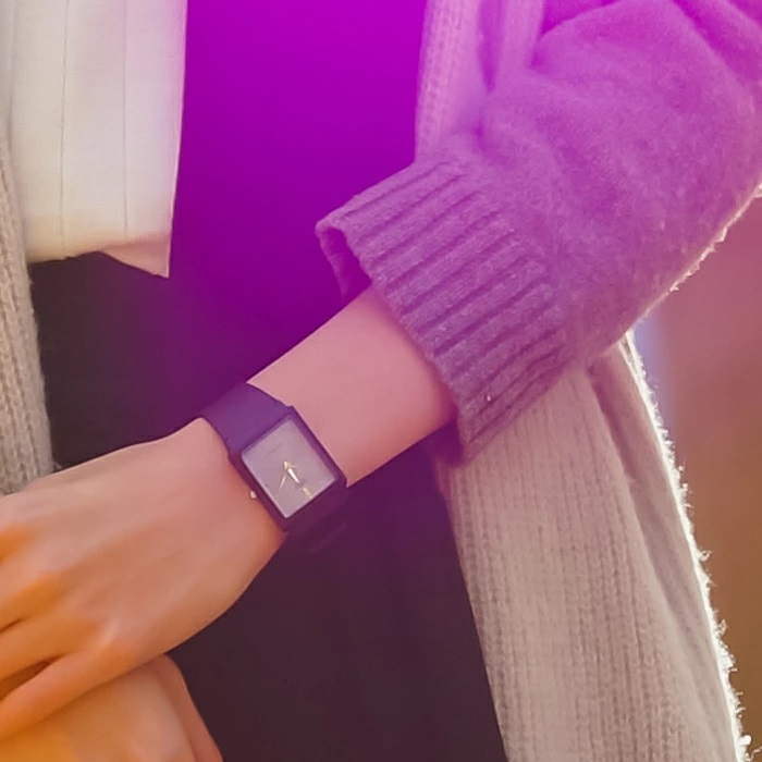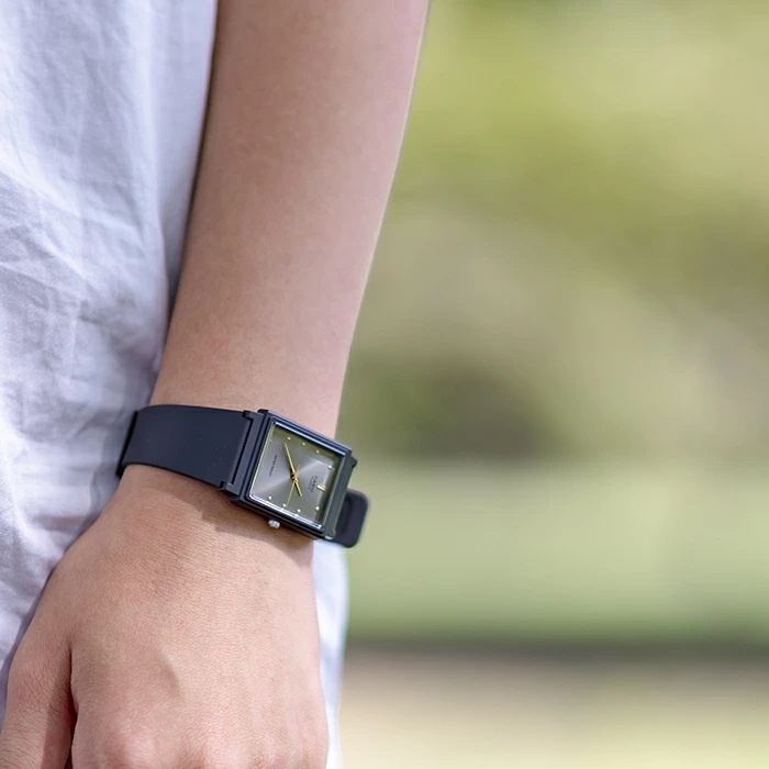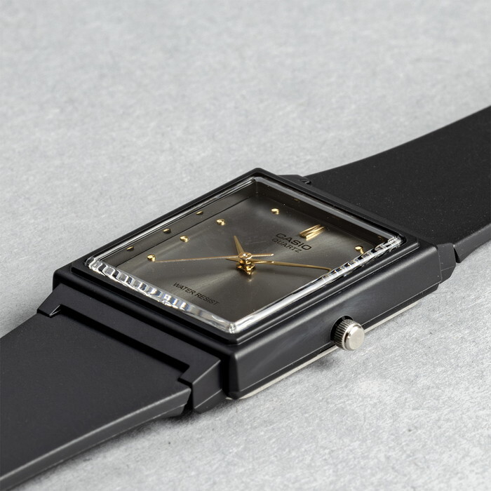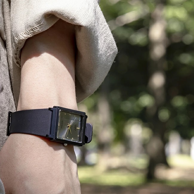 カシオMQ-38は、優美なデザインのレクタンギュラーウォッチです。最大の特徴は文字盤の色彩で、光を放射状に反射するサンレイ仕上げが施されているため、文字盤カラーが見る角度によって、深みのある色合いに変化します。インデックスの装飾も華やかで、文字盤上できらめく様は、天空にうかぶ星座のようです。時分針は、王制時代のフランスにおける王太子妃(dauphine)を意味するドルフィン針で、優雅なデザインのドレスウォッチによく用いられています。