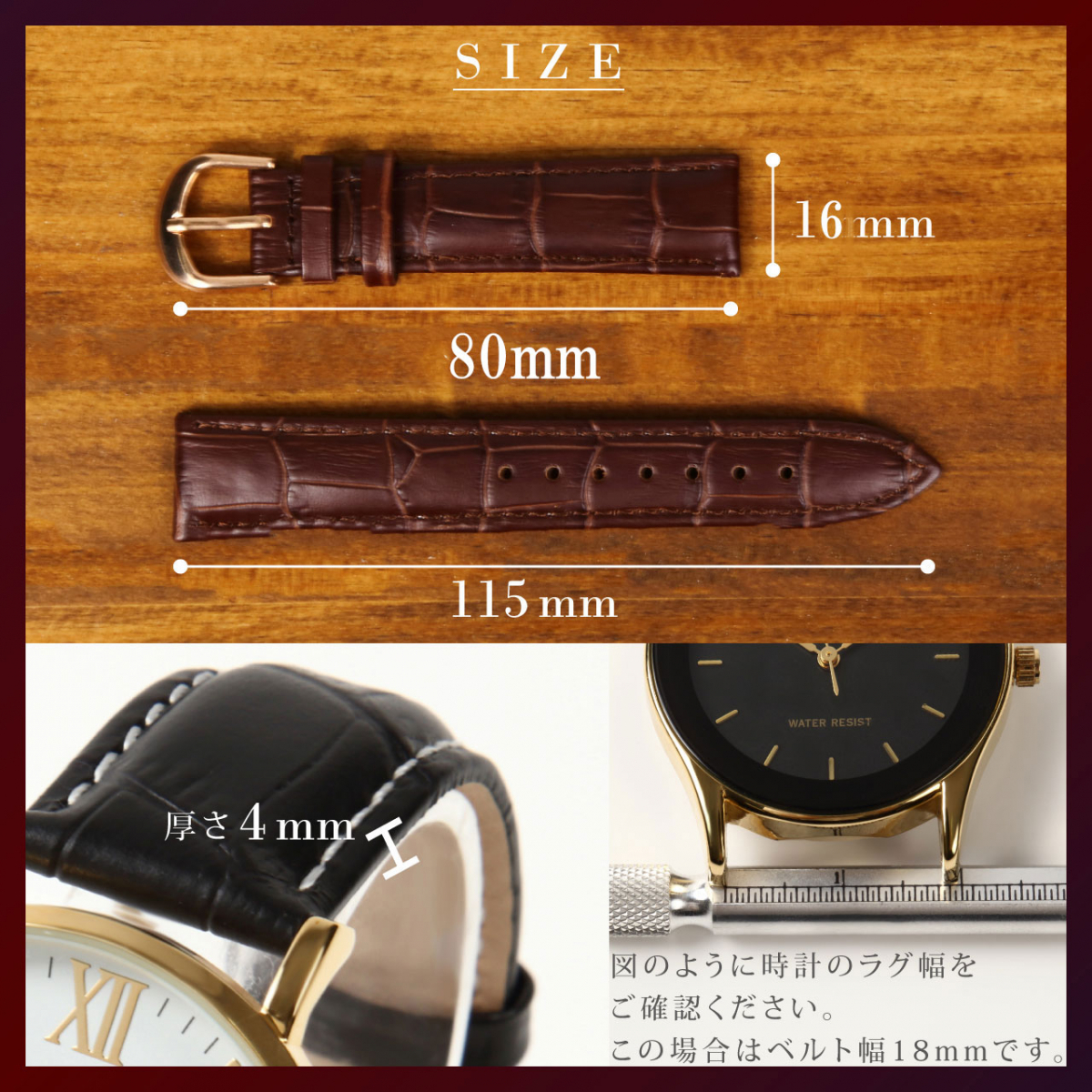 | 商品説明 | ご覧頂きありがとうございます! ■サイズ■ 長さ:6時側 115mm /12時側 80mm(金具を含む) 幅:16mm 厚さ:4mm (腕時計のベルト幅・厚さを測り適切なサイズをお選びください。) ■素材■ カーフレザー(クロコ風型押し) /バックル部:ステンレス(バックル部分にはステンレス製尾錠を採用。丁寧に磨いた光沢、サビに強いです。 ■状態■ 新品 服装によって時計のイメージを変えたいと思ったことはありませんか? パターンが豊富で着せ替え感覚で、時計のイメージを変えれます。 ビジネスシーンには控えめなブラック、ダークブラウン 休日にはブラウン/白ステッチを選択、ジーンズとT-シャツで地味になりがちな コーディネートにワンポイントのアクセント 祖父の形見の腕時計、ボロボロの革ベルトを交換すれば定番時計に。 軽く腕に馴染む柔らかいクロコダイル型押し柄の革素材。 金属アレルギーの方、皮膚の弱い方にも安心 汗をかきやすい外仕事やアウトドアシーン。汚れや臭いが気になったら 時計から外し、気軽に交換できます。 ビジネスにもプライベートにも使いやすいシンプルなデザイン、時計の雰囲気をワンランク上げてくれます。 季節をとわず使えるアイテムです! ■注意事項■ ※当該商品は自社販売と在庫を共有しているため、 在庫更新のタイミングにより、在庫切れの場合やむをえずキャンセルさせていただく可能性があります。 ※ご利用のモニタ環境によって掲載写真と実際の商品の色味が異なる場合がございます。 ※内容品はベルトとバネ棒、取付マニュアルです。その他の附属品はありません。 *商品に重大な欠陥があった場合、到着から7日以内に連絡頂ければ返品に応じます。 *ご落札から一週間以内のご連絡が頂けませんでしたら、理由を問わず取り消させて頂きます。 ■発送方法■ 出品者の負担で発送致します。 ■全国一律無料 *発送後に追跡番号をお知らせします。 *梱包材料&梱包手数料はいただいておりません(無料) *送料過不足による、差額請求ならびに返金は致しませんのでご了承下さい。 *ご入金のご連絡から早くて当日、遅くとも二日以内には発送させて頂きます |