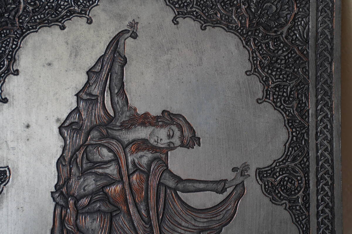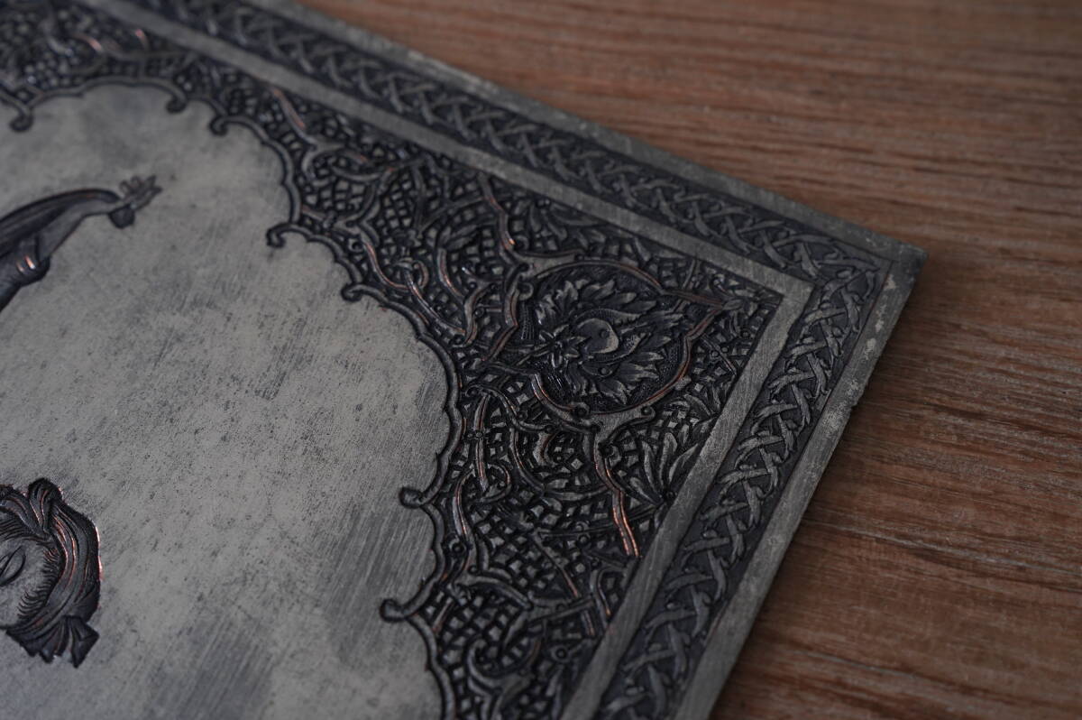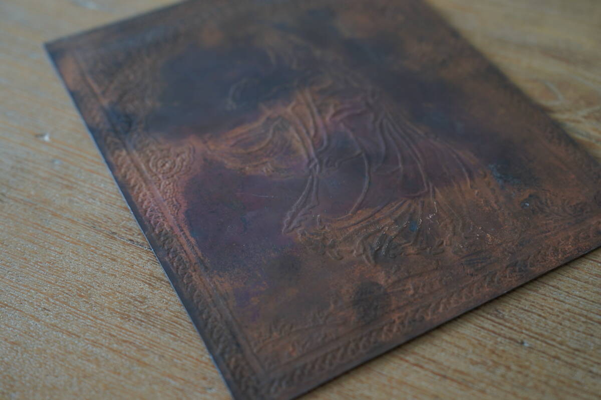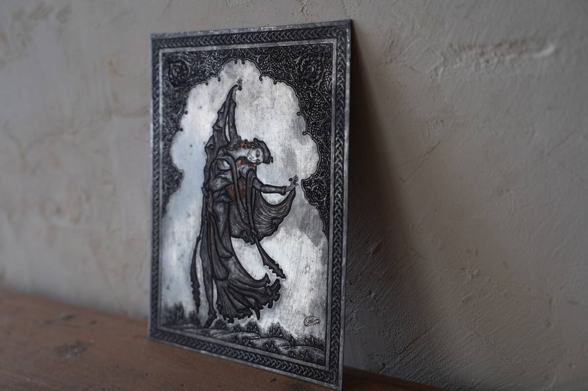 こちらは、銅のプレートを彫り込んで描かれた、神様の絵のオブジェです。