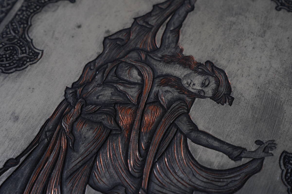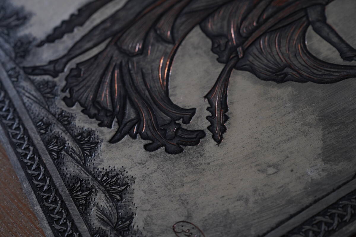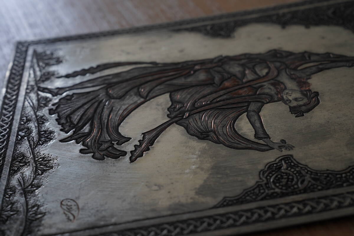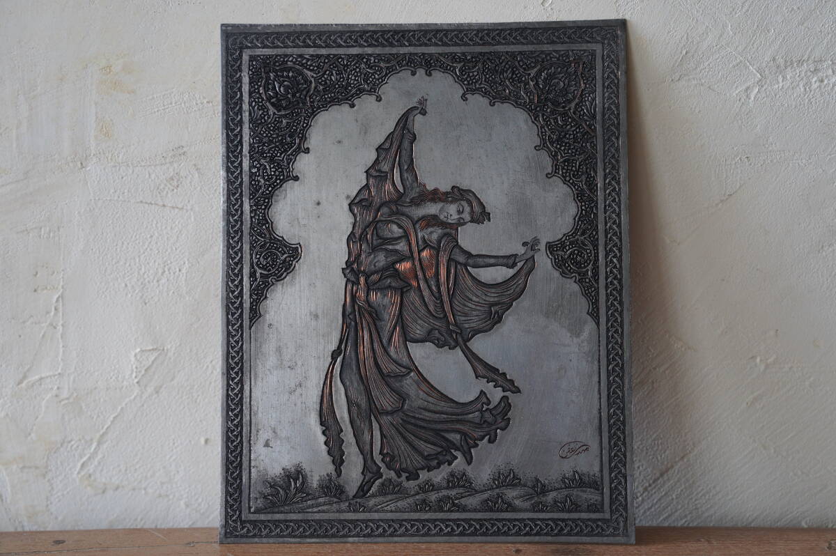 こちらは、銅のプレートを彫り込んで描かれた、神様の絵のオブジェです。