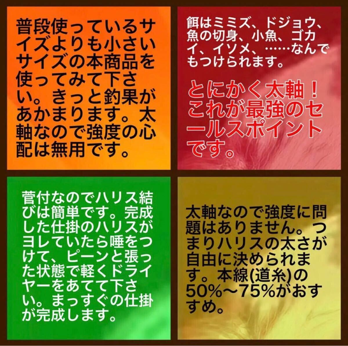 釣具に関してはこれまでにたくさんの方から購入いただいているために、値下不可とさせていただいていますが、まとめ買いやリピーターの方にはオマケの増量などでサービスをさせていたたいています。よろしく御願い致します。