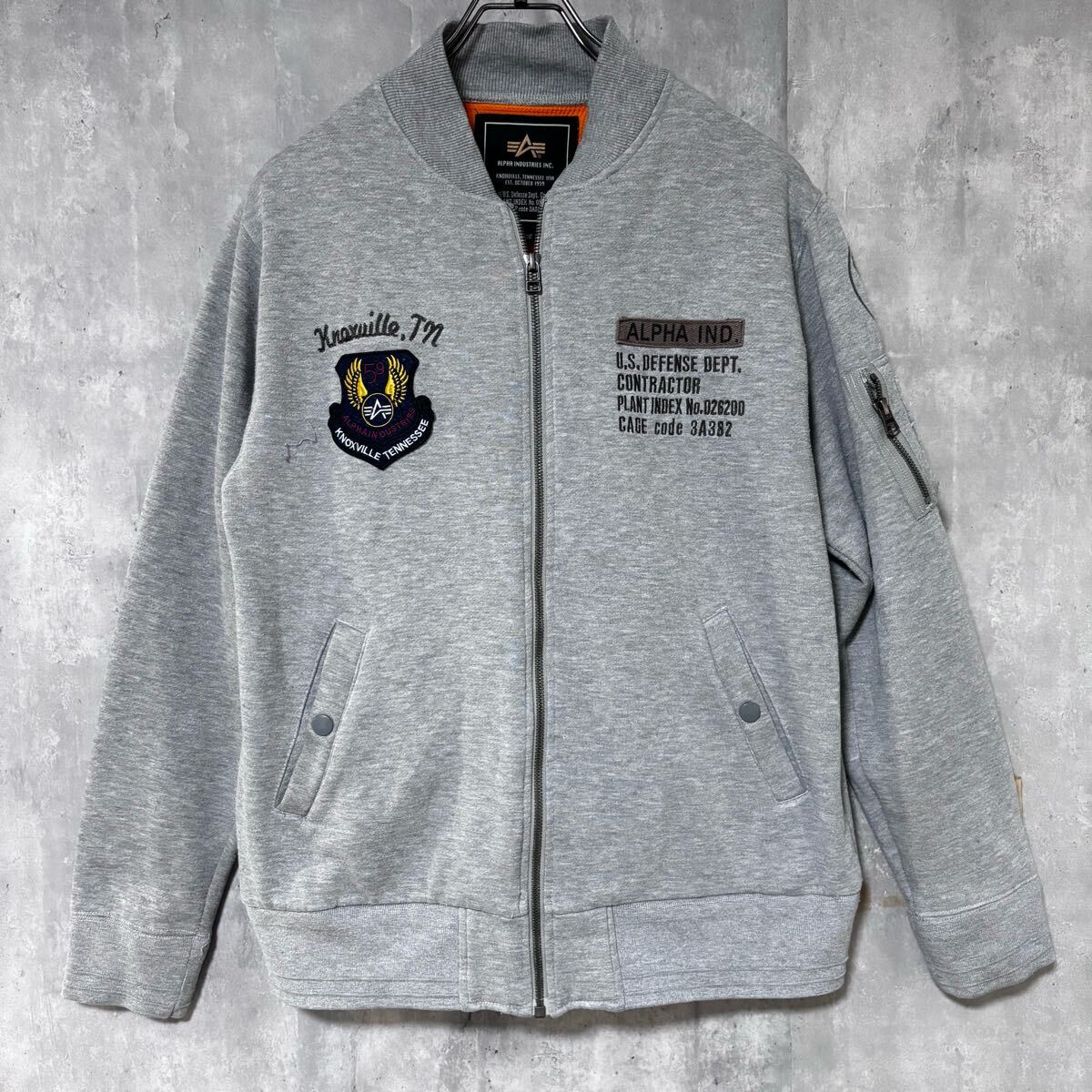 刺繍入りのグレーのALPHA INDUSTRIESスウェットジャケット、アメリカ製、Lサイズ。