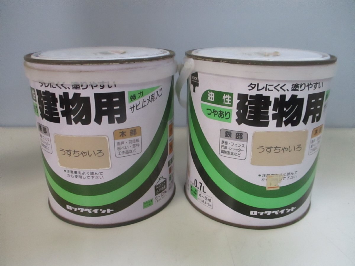 ロックペイント 油性 建物用・0.7L×2缶 商品詳細 【塗り面積(2回塗り)】4~5m2(タタミ約 2.4~3枚) 【乾燥時間】夏 6~8時間 冬 18~24時間 【塗り重ね可能時間】 塗り重ねる時は20℃で20時間以上、10℃で40時間以上乾かしてください。 【うすめ方】 塗料の粘度が高く塗りにくい時は、ペイントうすめ液で少しうすめてください (5~10%が目安です・銀は0~5%) 【用途】 (門扉、シャッター、物置、ロッカー・羽目板、戸袋、板塀、窓ワク、ドア 手すり、さん、工作品など。) ただし、高級家具、テーブルおよび床面を除く。 【特長】 ・ハケ伸びが良く、塗りやすいツヤありの塗料です。 ・タレが少なくインペイ性にすぐれてます。 ・ハケ目がたたず、美しい仕上がりで、耐久性付着性にすぐれてます。 ・有害な鉛、クロム系の化合物を原料として使用していません。 高耐久性・高付着性 合成樹脂調合ペイント・つやあり 特価品のため、缶にサビ・凹み・傷がある場合があります。 ★出品中の商品は、店頭でも販売しております。 店頭で売れた場合には期日に関わらずオークションを早期終了させていだきます (ご入札があった商品は直ちに店頭からお下げしておりますが、稀に入れ違いで売れてしまう場合もございます。ご了承くださいませ) 当社のオークションは返品・交換・キャンセル等は一切お断りさせて頂いております。充分ご検討の上ご入札下さいませ。 | |