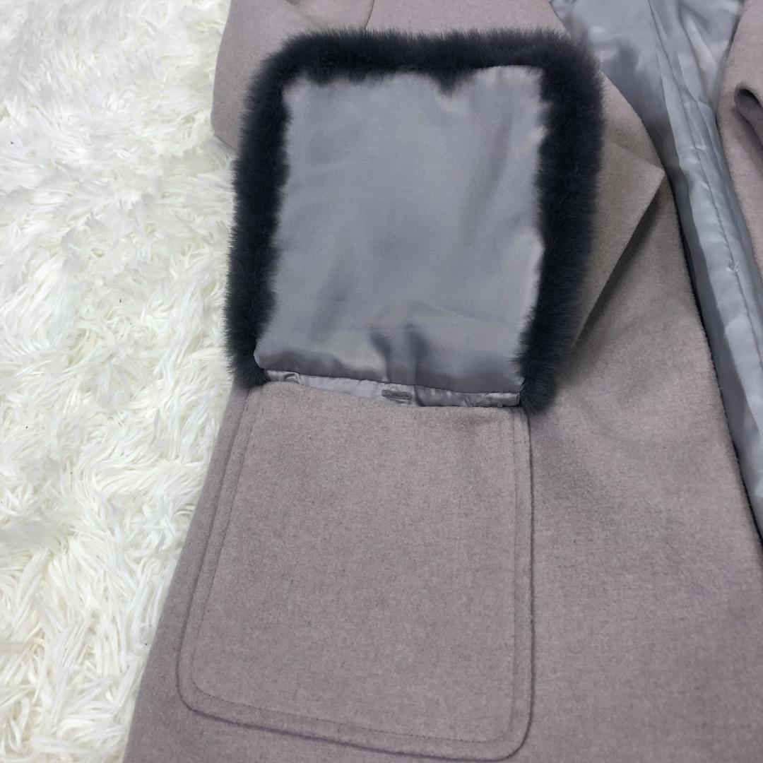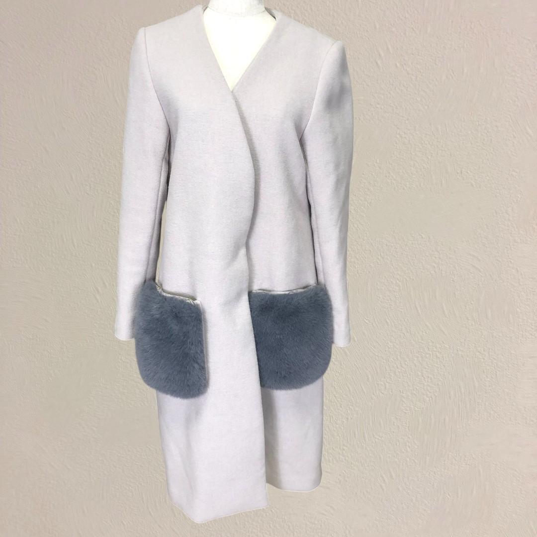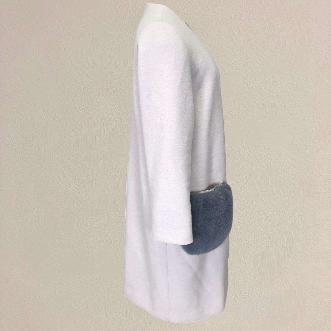 ファー付きポケットが目立つノーカラーコート、膝が隠れる丈です。前スナップボタン2つにて着脱します。スナップボタンは他人からは見えません。2つ目のボタンの下47cmはフリーになっているので動きやすいです。