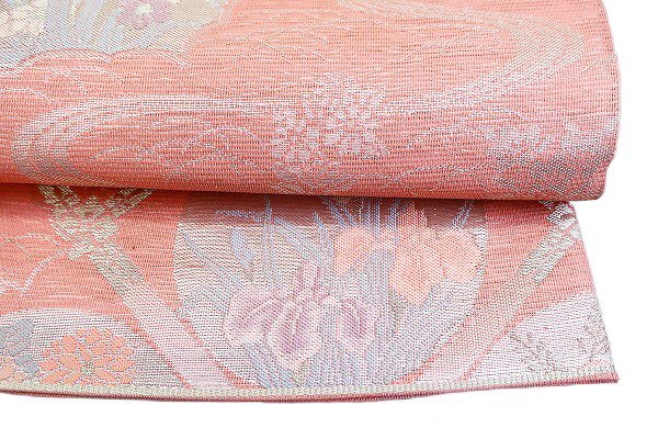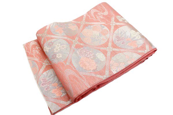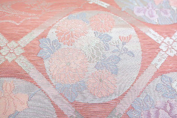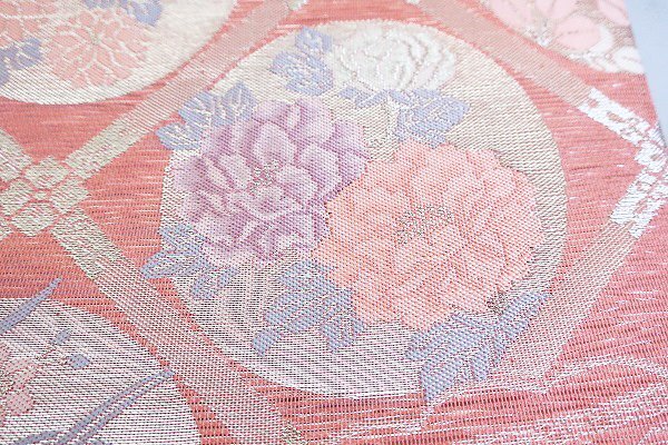 | 美品 袋帯 夏 夏帯 絽 ピンク 流水 牡丹 菊 枝花 銀糸 長さ4m28cm お洒落 正絹 お洒落 仕立て上がり 着物フィ m-7978 |