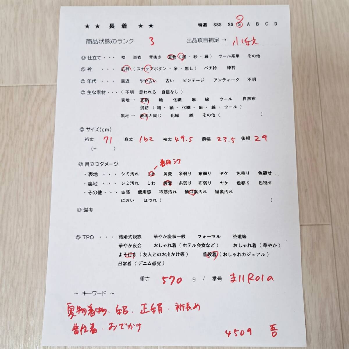 | Z | 着用向けではなくコレクション、鑑賞向けとして販売するお品ものです。布の力が無くリメイクも難しい場合が多いです。 様々な難やシミなどございますので、古き物をご理解いただける方のみご入札ください。ノンクレームノンリターンでお願いいたします。 |