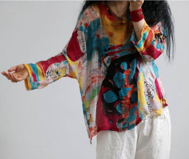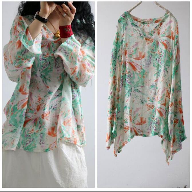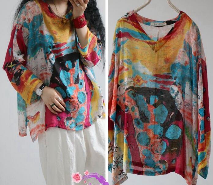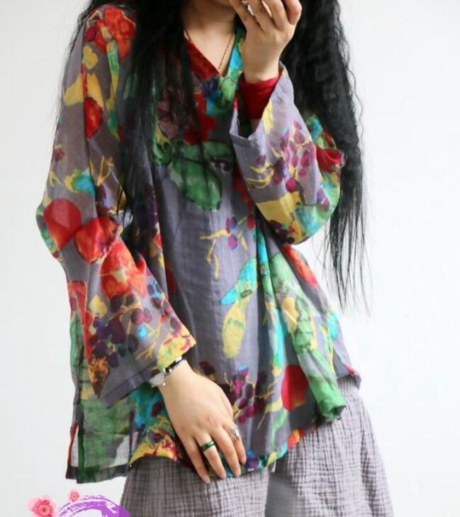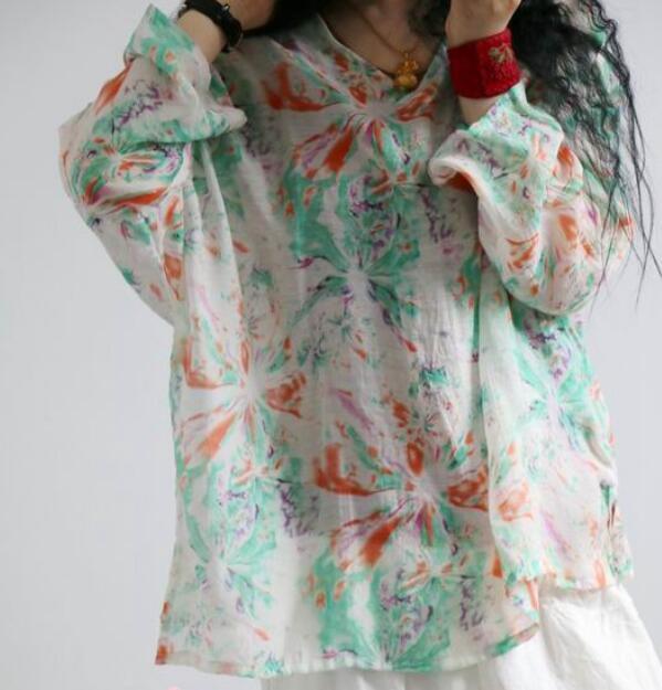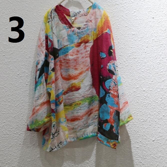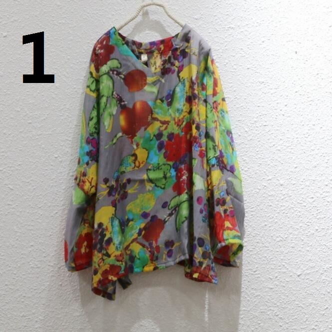 新入荷大人気Vネック チュニック 花柄 トップス アンティーク風 ロマンファッション ゆったり 麻100% 柄1