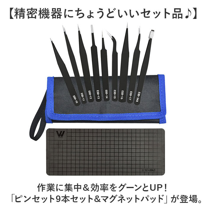 | 商品説明 | ・・【精密機器にちょうどいいセット品♪】 ・作業に集中&効率をグーンとUP!「ピンセット9本セット&マグネットパッド」が登場。 ・【充実のピンセット×9点】 ・電子機器、デザインワーク、時計修理など精密機器を扱うシーンに最適。いろんな用途に対応◎ ・【高品質だから手元が安定】 ・手にフィットし握りやすい面取り加工を施し、シャープに仕上げたピンセット。 ・【専用ケースでコンパクトに収納】 ・それぞれ独立して収納できる、専用ケースつき。ひっかけ紐つきで、壁に吊り下げて作業OK! ・【ESDコートで安心感UP♪】 ・静電気放電を防止するためのコーティング加工済み。安心して作業に集中。 ・【ネジの管理に!マグネットパッド】 ・磁力でネジがピタっとくっつき、作業中のネジの紛失を防止。ネジが転がらず、作業効率UP! ・【パットを使ってネジの位置確認◎】 ・ネジを種類別に仕分けができる、グリッド&マークつき。説明書を読みながらネジを整理。 ・【単品販売もご用意☆】 ・他ページにて、ピンセットとマグネットパッドの単品商品を販売中!用途に合わせてチョイス♪ |