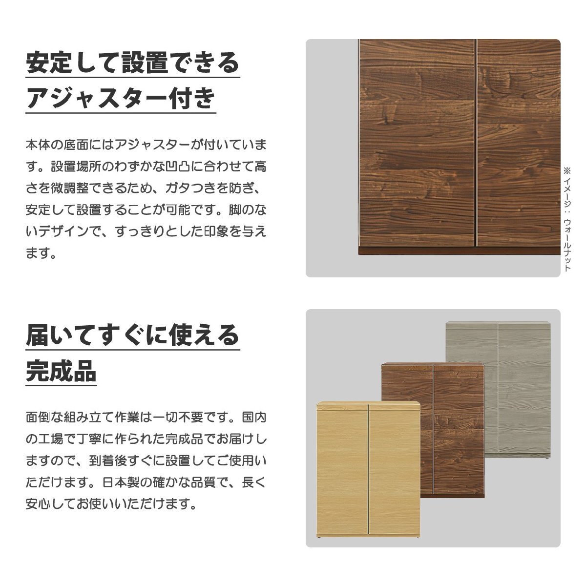 美しい木目調の本体にオーク無垢材の引手がアクセントを加えます。扉がゆっくりと静かに閉まるソフトクローズ機能や、棚板の落下を防ぐ耐震ダボを採用するなど、使いやすさと安全性に配慮しました。組み立て不要の完成品でお届けします。