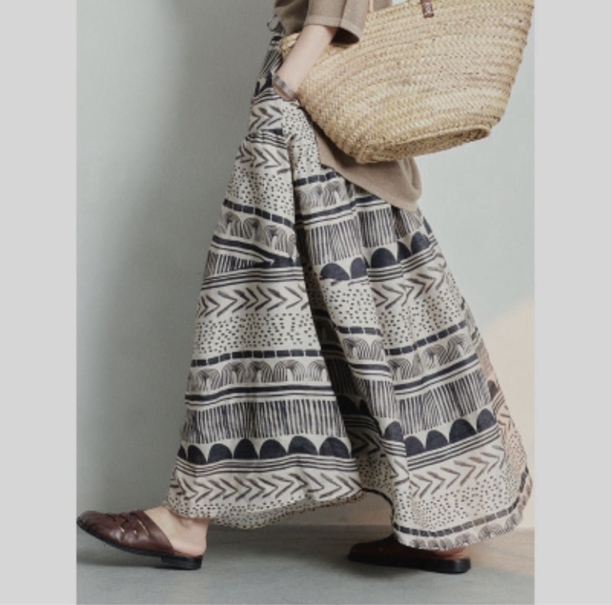 落ち着いたモノトーンのボヘミアン柄が大人可愛いロングスカート。