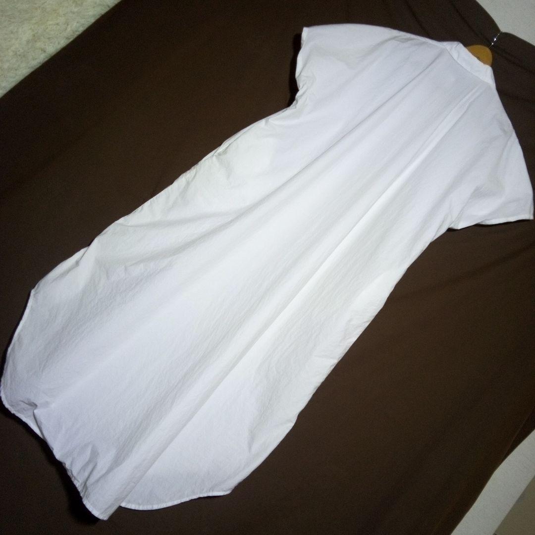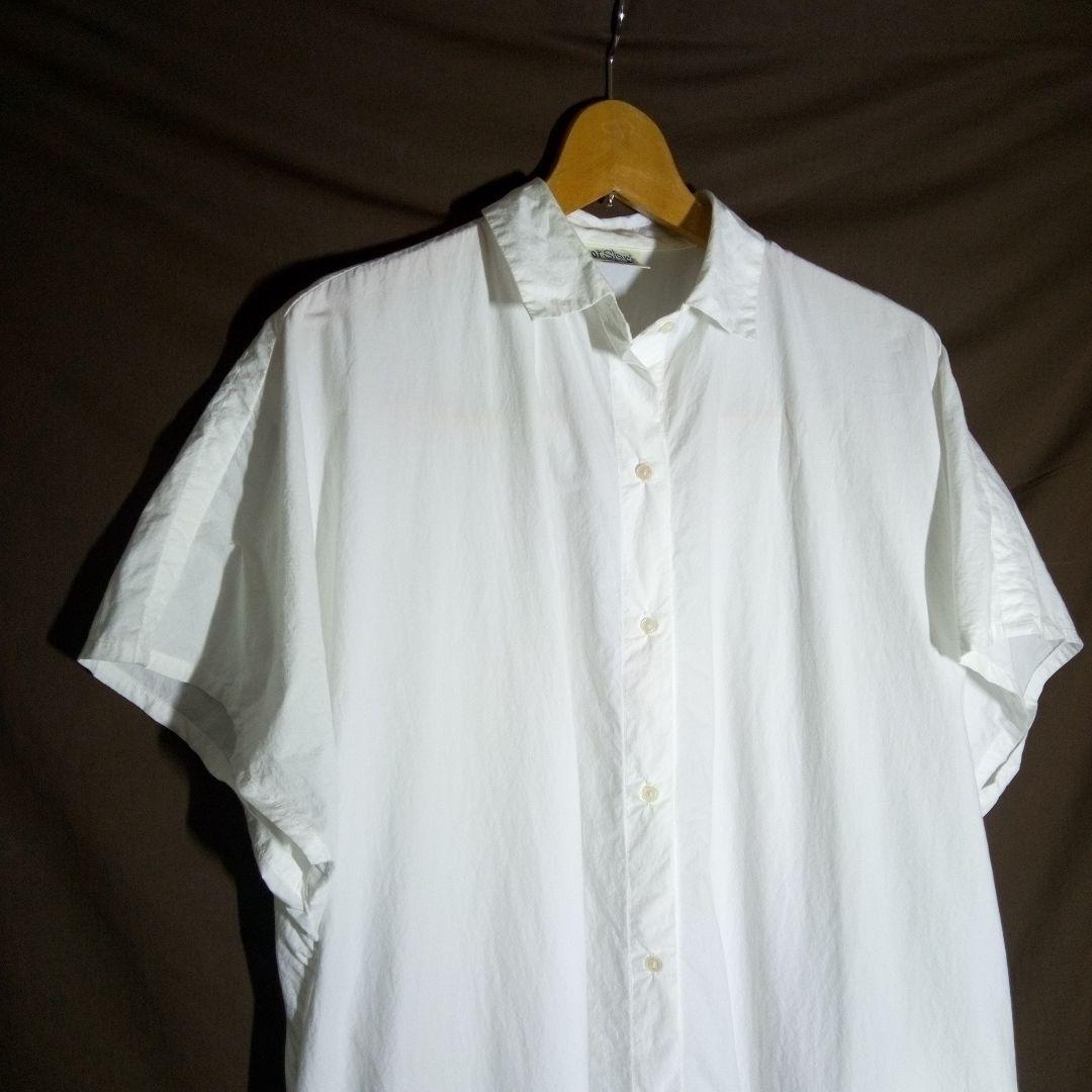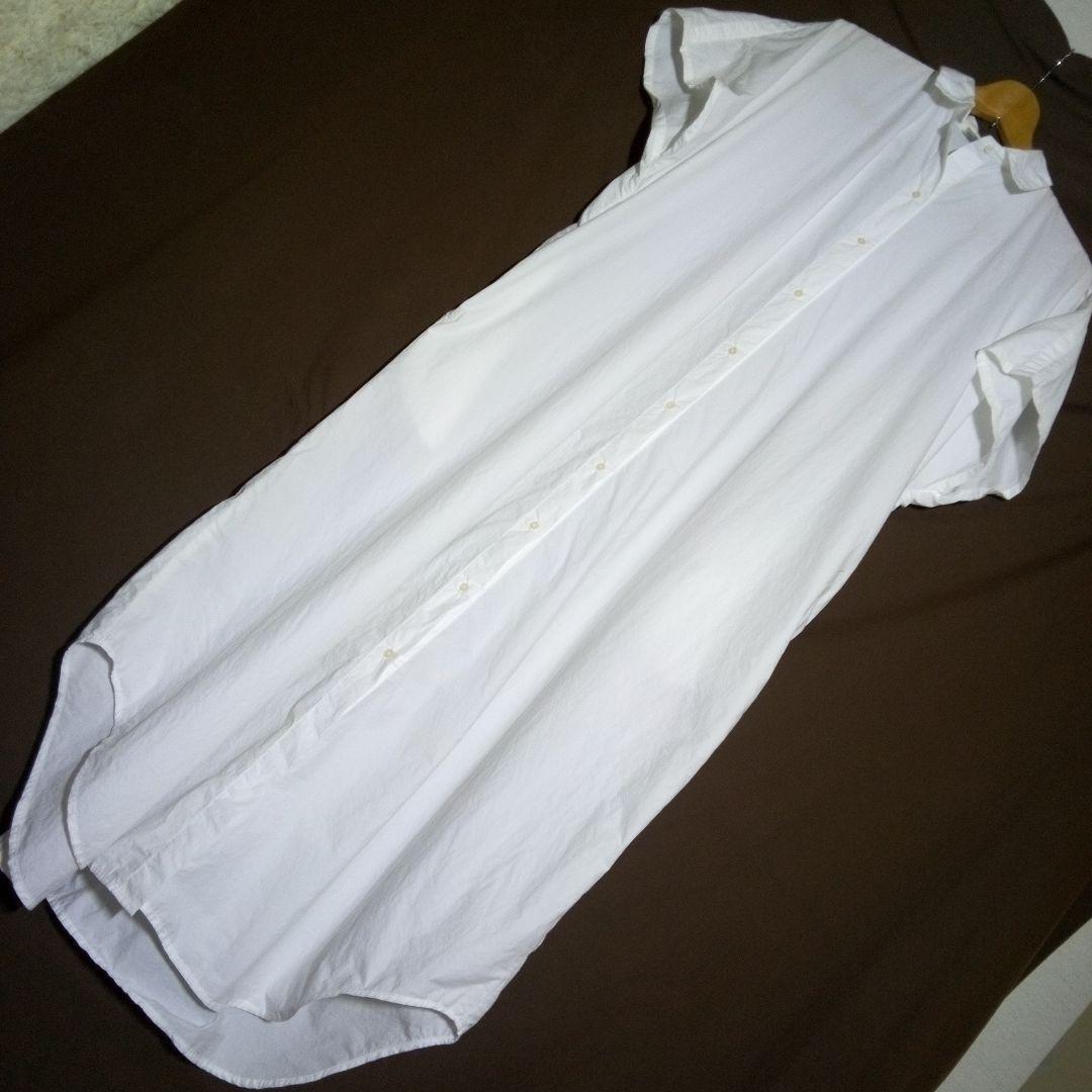 シンプルなホワイトの半袖シャツワンピース、ボタン前開きで着やすいデザイン。