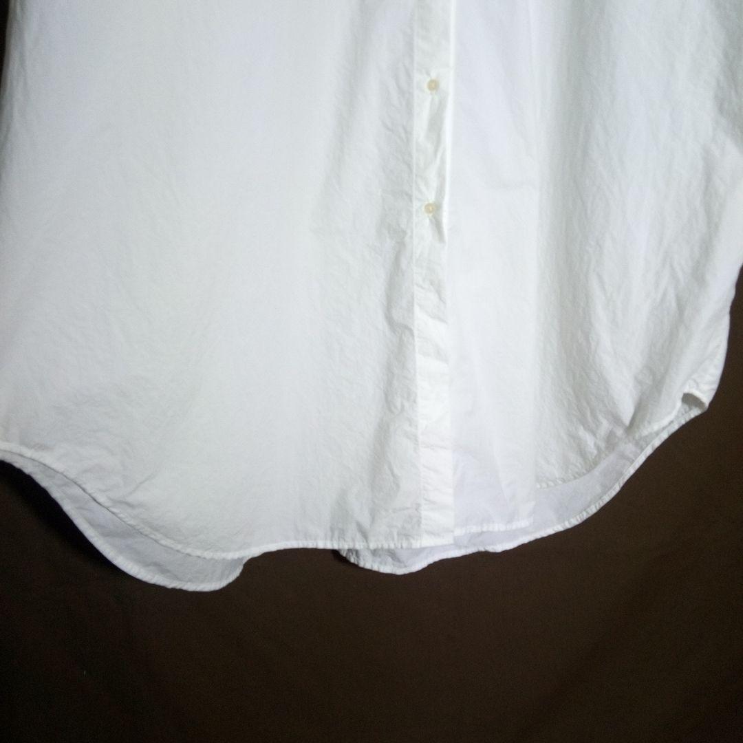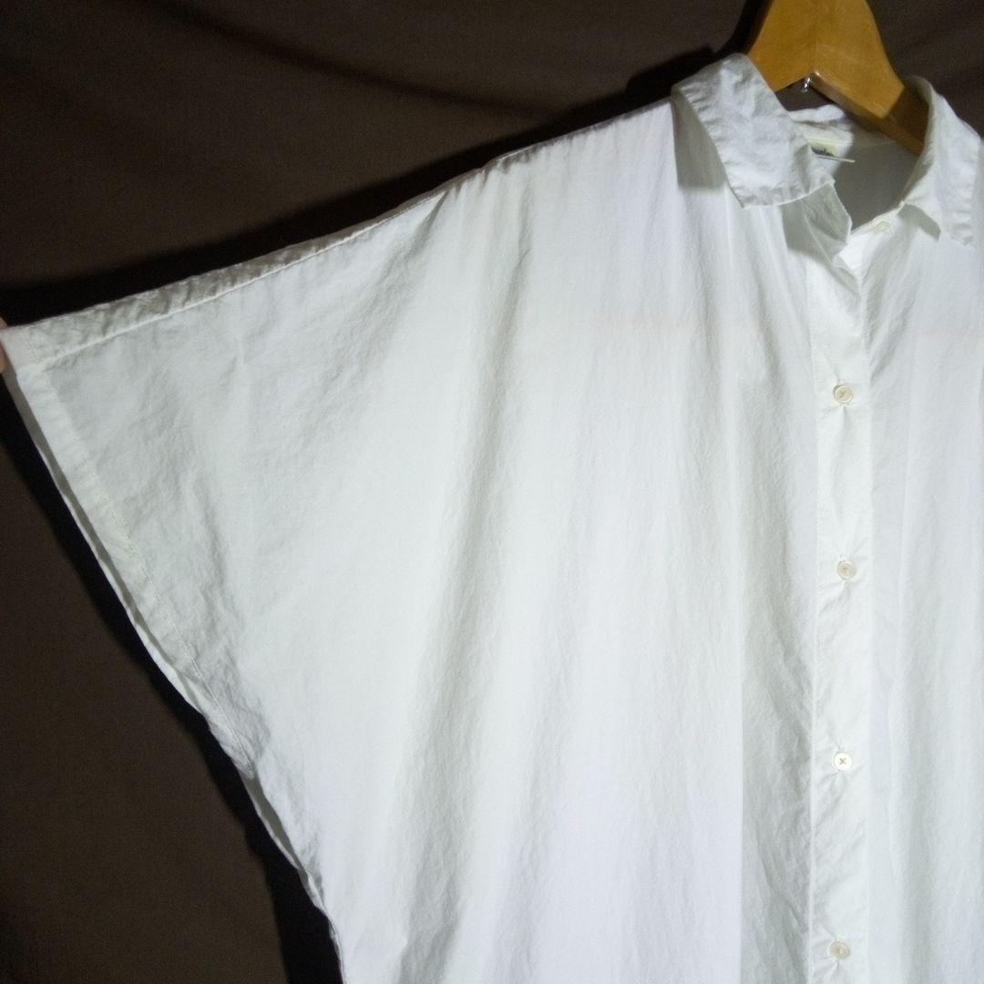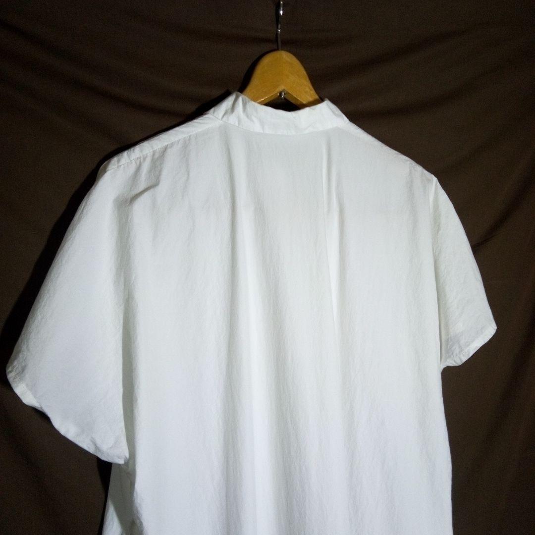 シンプルなホワイトの半袖シャツワンピース、ボタン前開きで着やすいデザイン。