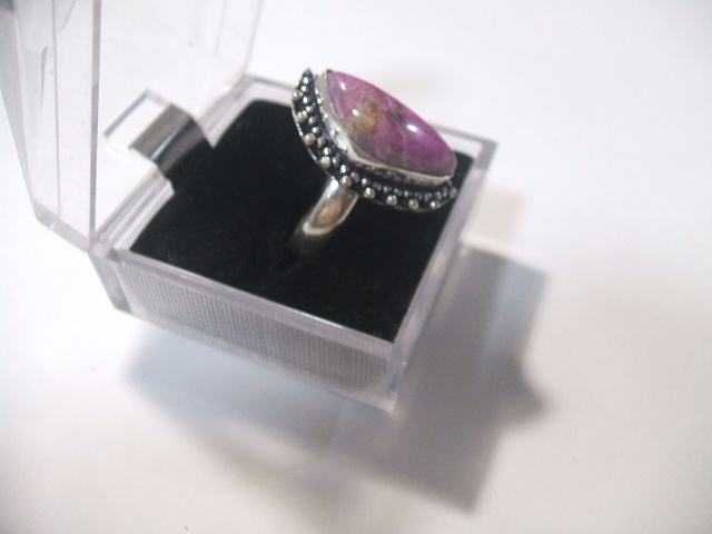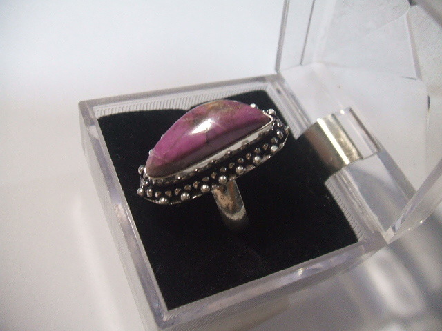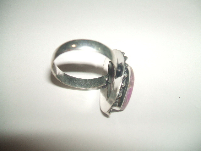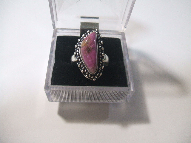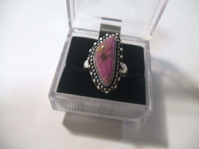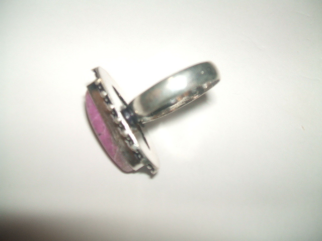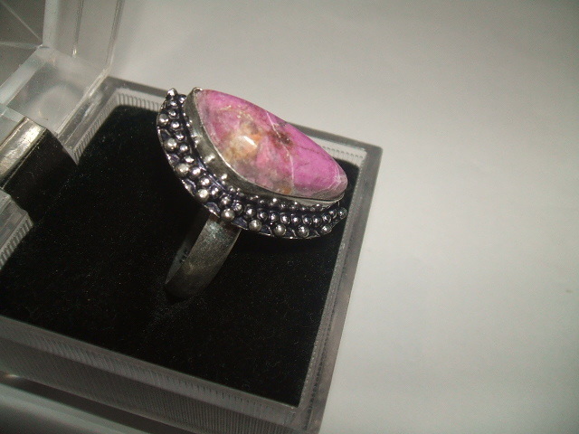 コバルトを含んでピンク色に発色したカルサイトのリングです。石の大きさは約2.1x0.8センチ。金属はシルバーで925の刻印があります。