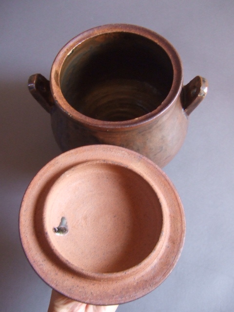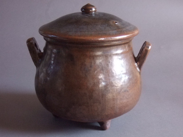 胴径23cm。高さ24.5cm。薩摩・苗代川焼の山ちょかですがこの大きさは初見です。時代は明治-昭和初期頃でしょうか。高台に「苗代川」の銘が釘彫られています。昭和9年刊の「工芸」で柳宗悦は山ちょかを「山で主に飯をたくのに使う」と書いていますがそこで紹介のものよりも一回り半も大きい本品で炊き込みご飯などを炊くとさぞおいしいのではないでしょうか。野趣あふれる薩摩のくろもんの逸品です。使用のためか底にニュウが見られますので実際に火にかけるためには養生が必要です。西洋で行われているのはニンニクの断面を擦りつけて乾かす方法で、実際当方も炊飯に用いる土鍋のニュウに施していますが日々の直火にも耐える大変良い養生法です。