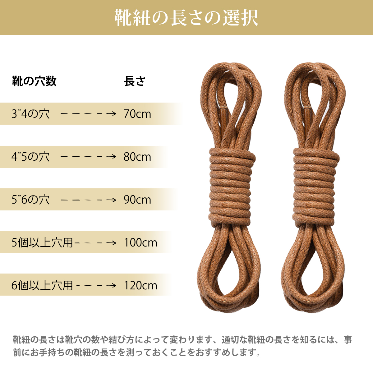 コロケーションルール | 靴紐の長さは適切なものを選んだ方が良い 60cm2~3つの穴用 70cm3~4つの穴用 80cm4~5つの穴用 90cm5~6つの穴用 100cm5つの穴以上用 120cm6つの穴以上用 140cm長靴用 (上記の長さは参考用です。特殊な靴タイプまたはオリジナルの靴紐の場合は、元の長さに応じて購入することをお勧めします。) |