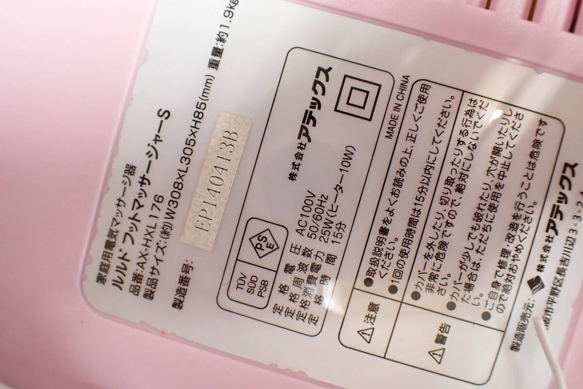 アテックス ルルド フットマッサージャーS AX-HXL176 ピンク マッサージ器 動作確認済 Z-MC 中古品です。 もみ玉部分に僅かな汚れがありますが、全体的に綺麗な状態です。 短時間の動作確認済です。 詳しい状態などは画像を参考に判断してください。 状態の説明はあくまでも出品者の主観ですので、神経質な方のご入札はお控え願います。 写真に写っている物がすべてですので、その他に付属品などはありません。 ※ご使用のパソコン、モニターなどの環境によっては実際の色と若干異なって見える場合がございます。 お探しの方はお見逃しなく! この機会にぜひどうぞ! ノークレーム・ノーリターンとなります。 よろしくお願いします。 特定商取引法に基づく表記 【会社名】 株式会社 西川殖産 【代表取締役】 西川 守 【古物営業許可】 兵庫県公安委員会許可 第631641300006号 【店舗】 エタニティ野里店 【営業所所在地】 兵庫県姫路市野里311-3 アクロポリスⅡ-1F 【連絡先】 079-222-7705 【営業時間】 午前10時~午後7時 【定休日等】 水曜日は定休日となっておりますので、火曜日の夕方から水曜日にご入金、ご連絡などをしていただいた方へのご連絡・発送などは翌日以降となってしまいます。 オークションにつきましても、火曜日の夜から水曜日にご落札していただいた方へのご連絡は翌日以降となってしまいます。 ※その他、GW・お盆・年末年始などもお休みを頂いておりますので、その期間中などもご連絡・発送などできません。(※休みの期間はその都度異なりますので、お急ぎの方は事前にご質問などでご確認していただけますよう、よろしくお願いします。) こちらの都合で誠に申し訳ありませんが、あらかじめご了承いただいた方のご入札をお願い致します。 | |||
