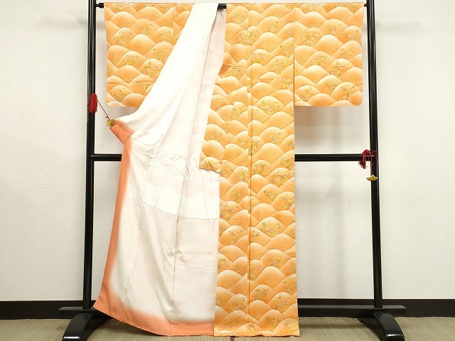 身丈 165.5cm(肩から) 裄丈 67.5cm 袖丈 53cm 縫込み 7cm 袖幅 34cm 前幅 24.5cm 後幅 30.5cm 着物縫いこみ 内揚げ 1.5cm 裄 お袖側 約1cm 身頃側 約1.5cm 《 サイズについてはこちら 》 |