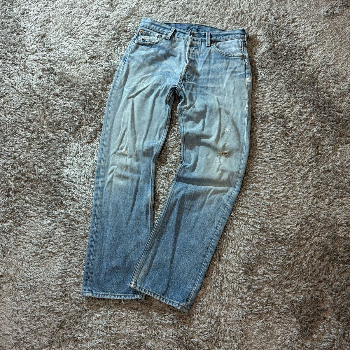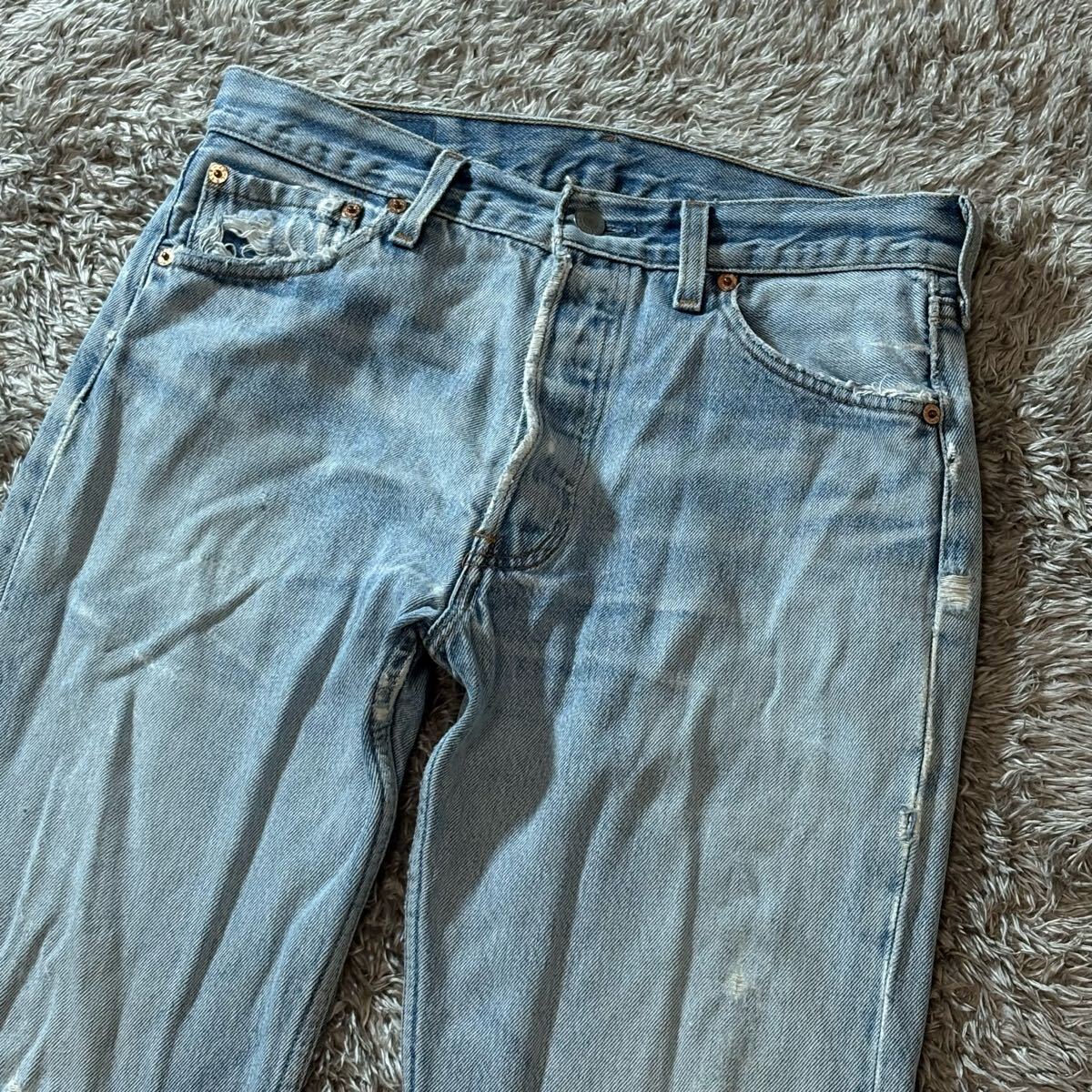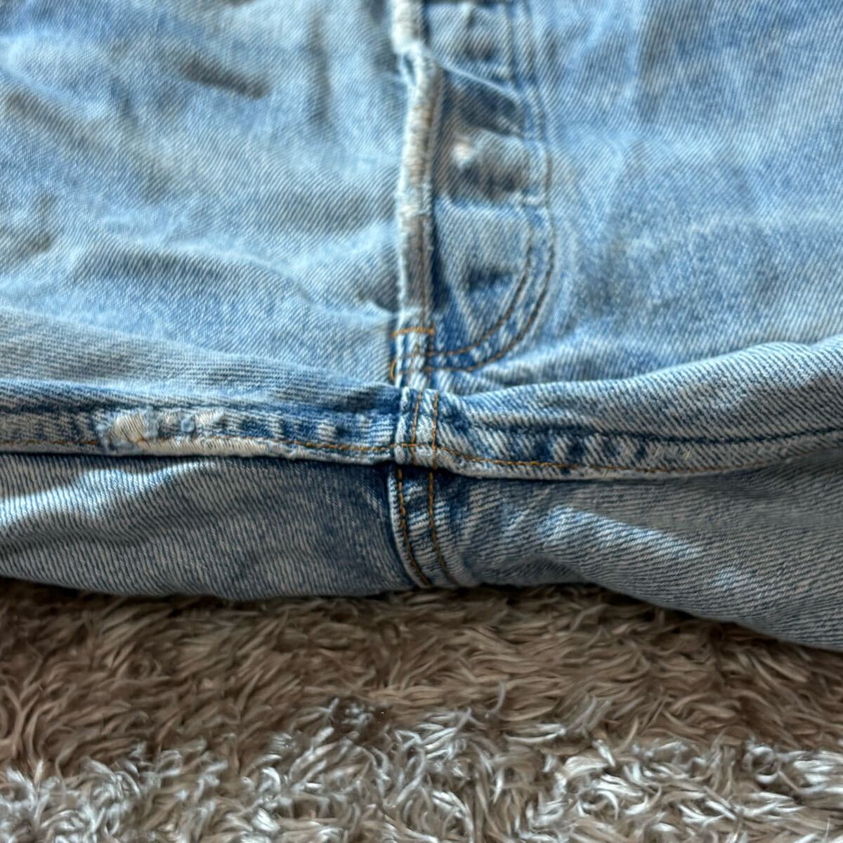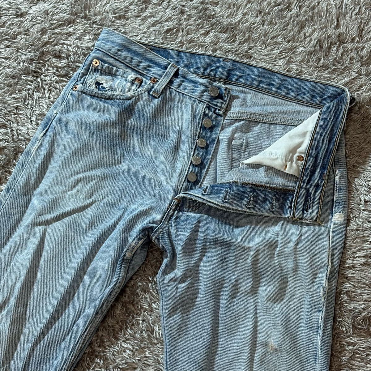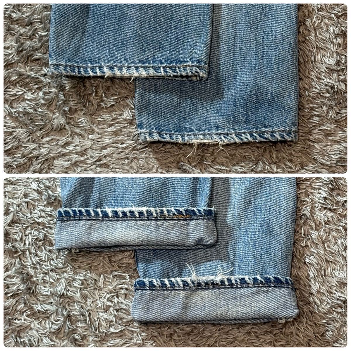 美しいヒゲ落ちと濃淡の効いたフェード、フロントやポケットのダメージがヴィンテージ感を演出しています。穿き込まれた風合いが魅力で、古着好きにはたまらない一本です。