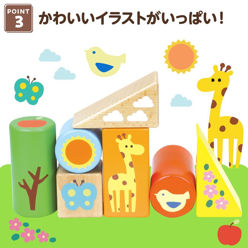 セット内容:円柱(ビーズ)×1、円柱(小)×1、円柱(大)×2、立方体×1、直方体(木玉)×1、直方体×1、三角×2、木箱×1