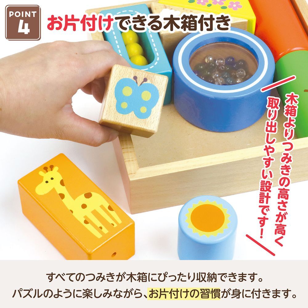 振ると音が鳴るかわいいつみきです。リンリン(鈴)、カラカラ(木玉)、シャカシャカ(ビーズ)と異なる3種類の音を楽しめ、聴覚を含めた多様な感覚を育むことができます。ビーズや木玉は動きが見えて視覚的にも楽しいものになっています。さらに基尺がそろっているため、並べたり積んだりする動作もスムーズです。初めてのおもちゃにも最適な大きめサイズで、小さな手にもぴったりフィットします。全てのパーツは面取り加工済みの角丸設計で、安心安全にお使いいただけます。木箱付きでパズル感覚でお片付けが楽しめます。ラッピング袋付きでギフトとしてもおすすめです。