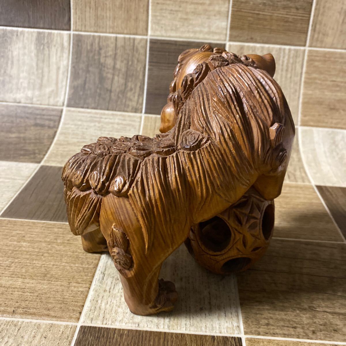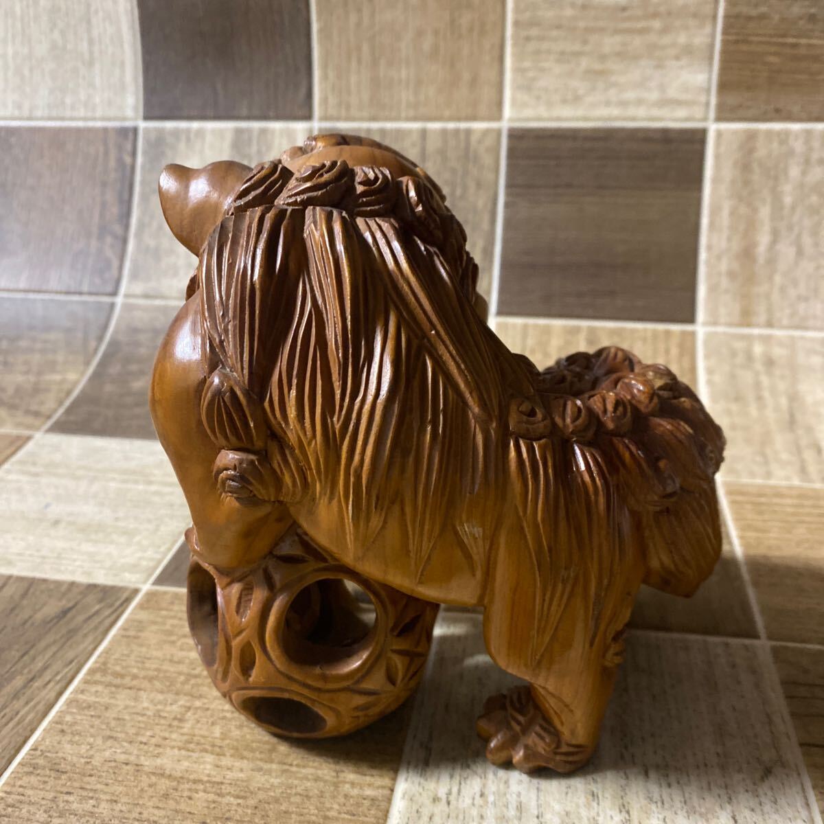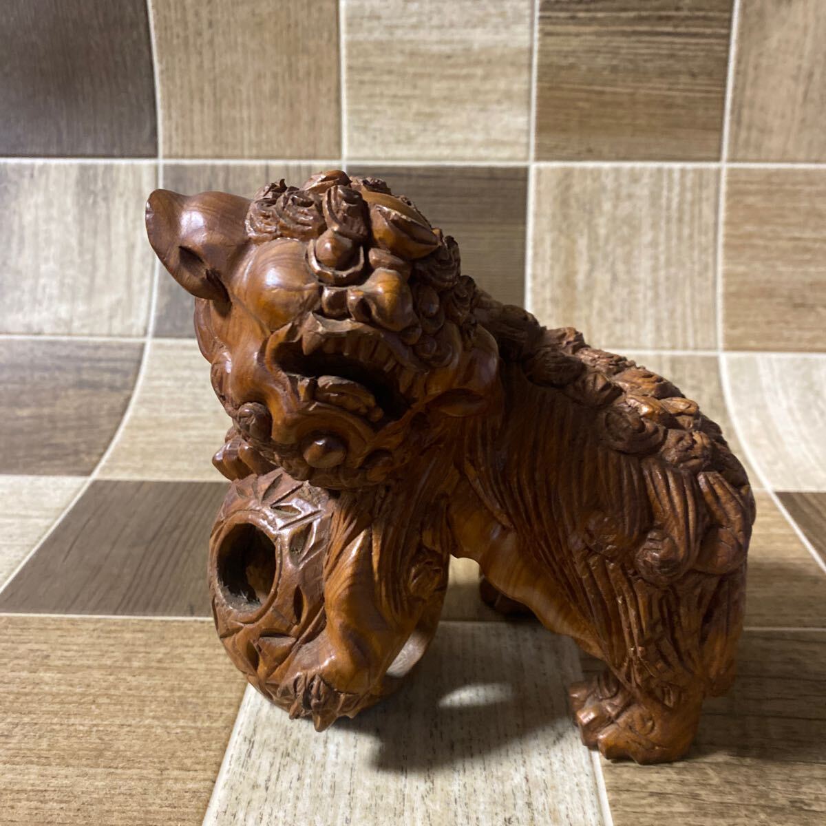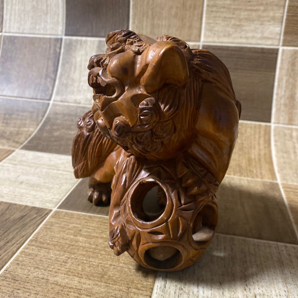 こちらは 玉乗り獅子 木彫り 木工品 伝統工芸品 彫刻 シーサー 狛犬 玉入り 置物 オブジェ インテリア アンティーク レトロ 中古品 です。