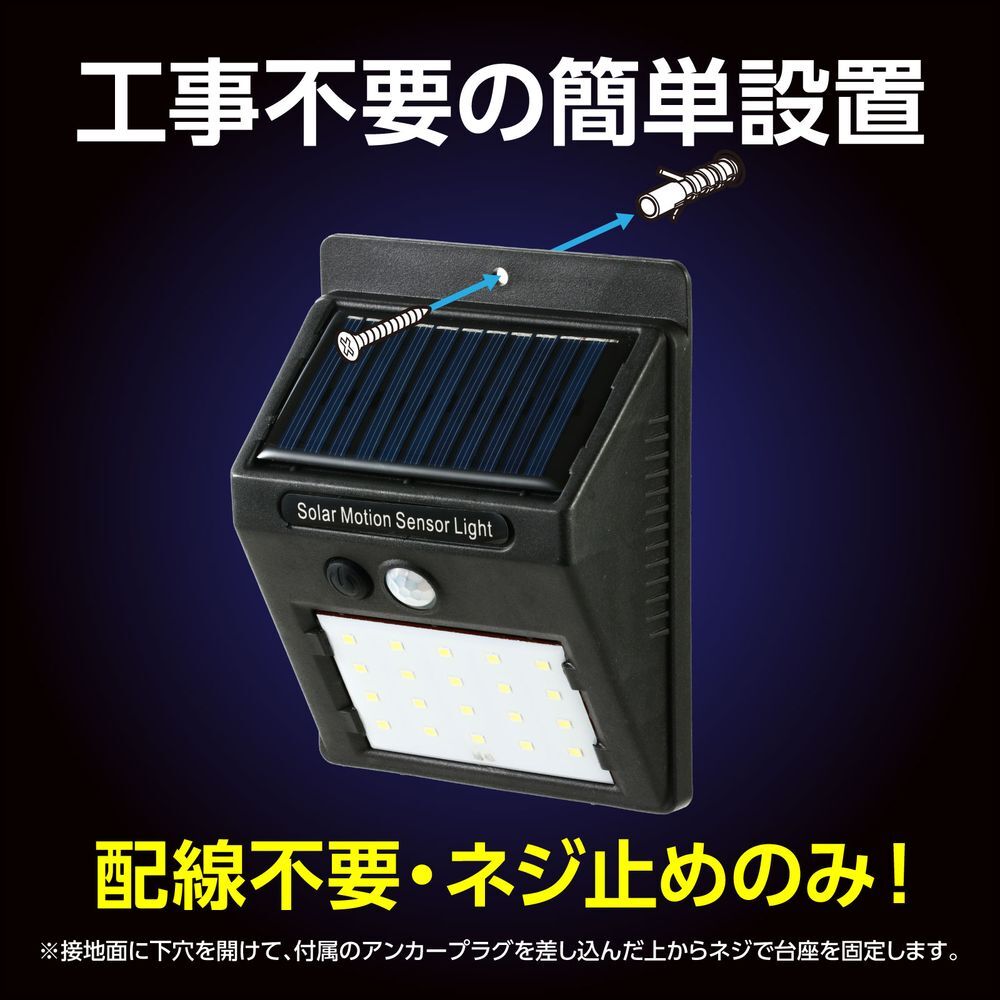 雨やホコリに強い防水・防塵IP65適応のセンサーライトです。付属のソーラーパネルで充電するので電池交換が不要で、環境にも優しい一品です。人感センサー機能を搭載しており、人の動きを感知して自動で点灯するため、防犯対策としても活躍します。さらに、壁への取り付けが簡単で、玄関、庭、駐車場など幅広い場所で使用可能。