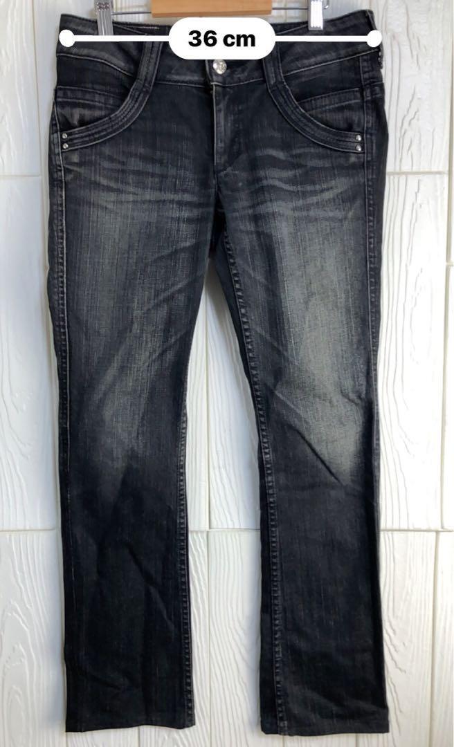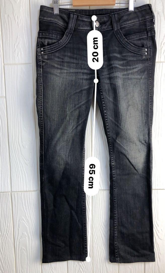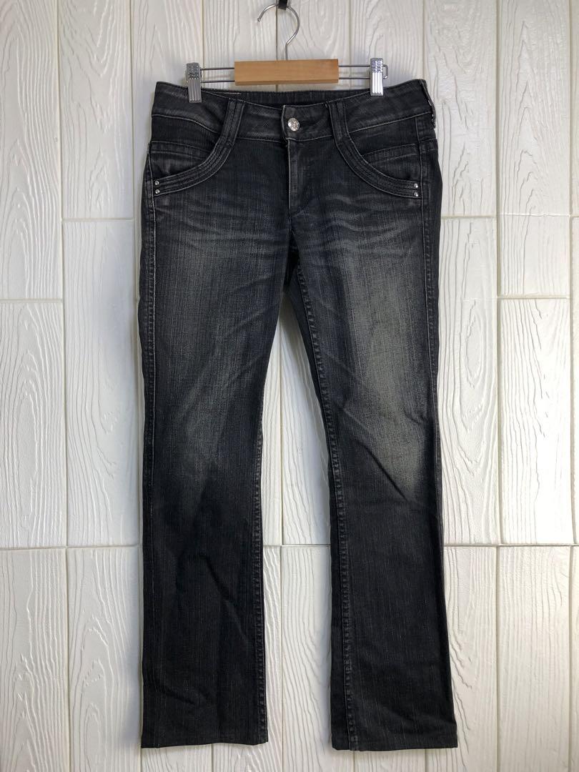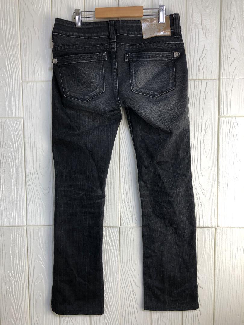 ダークグレーのブーツカットデニム、ウエスト72cm、股下65cm、前股上20cmのスタイリッシュなデザイン。