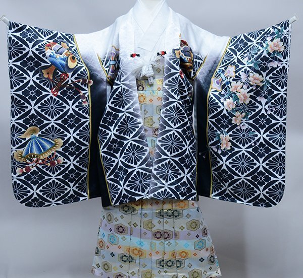 | 品質 | すべて新品 仕立て上がり(すぐ着用できます) ※既製品ですが、上げはとられていないので、一般的な三歳~五歳サイズですとお直し(肩上げ腰上げ)が必要です ★綸子地に金糸で彩られた豪華な柄がキラリと光る祝着です。 綺麗な染料で染色されていて、とても見栄えが良いです♪ ★羽織、着物、袴の表地に高質ポリエステルを使用 ・高質ポリエステルの特徴 1.正絹と比べても見劣りしません。 (むしろ低質な正絹よりも高質ポリエステルの方が、見栄えが断然良いです。) ※ポリエステルより正絹が良い品質とされたのは、昔のこと。 近年の合繊技術向上により、ほとんど見劣ることがございません。 2.合繊であるため正絹と比べて保存状態が良く、長い時間を経ても状態が変化しにくいです。 3.万一、汚れても洗うことができます。 その場合は、クリーニングに出すことをお勧めいたしますが、正絹より安価で取り扱っていただけます。 ★豪華でおしゃれな地紋の紋袴 羽織、着物、長襦袢、袴→表裏地ともに高質ポリエステル100% 草履→合皮素材  |