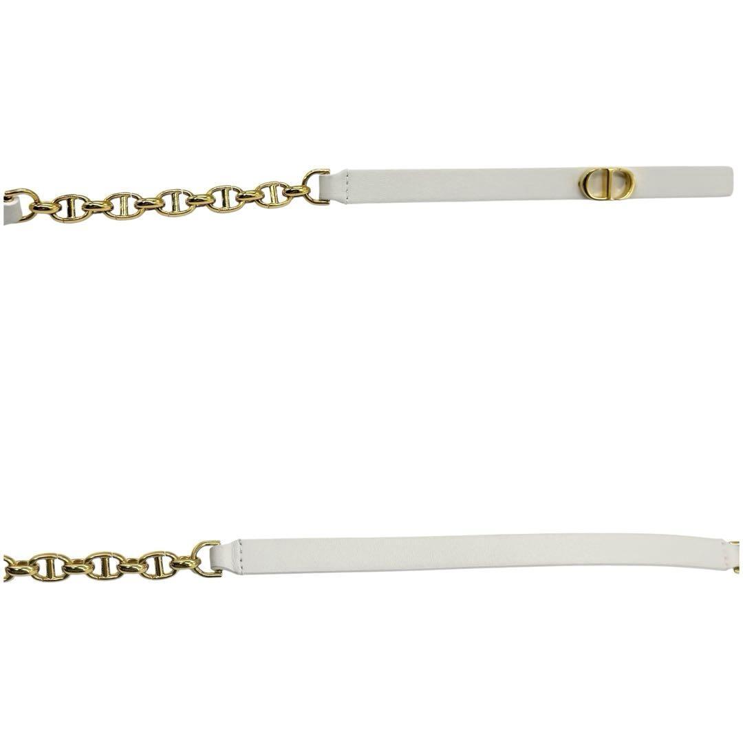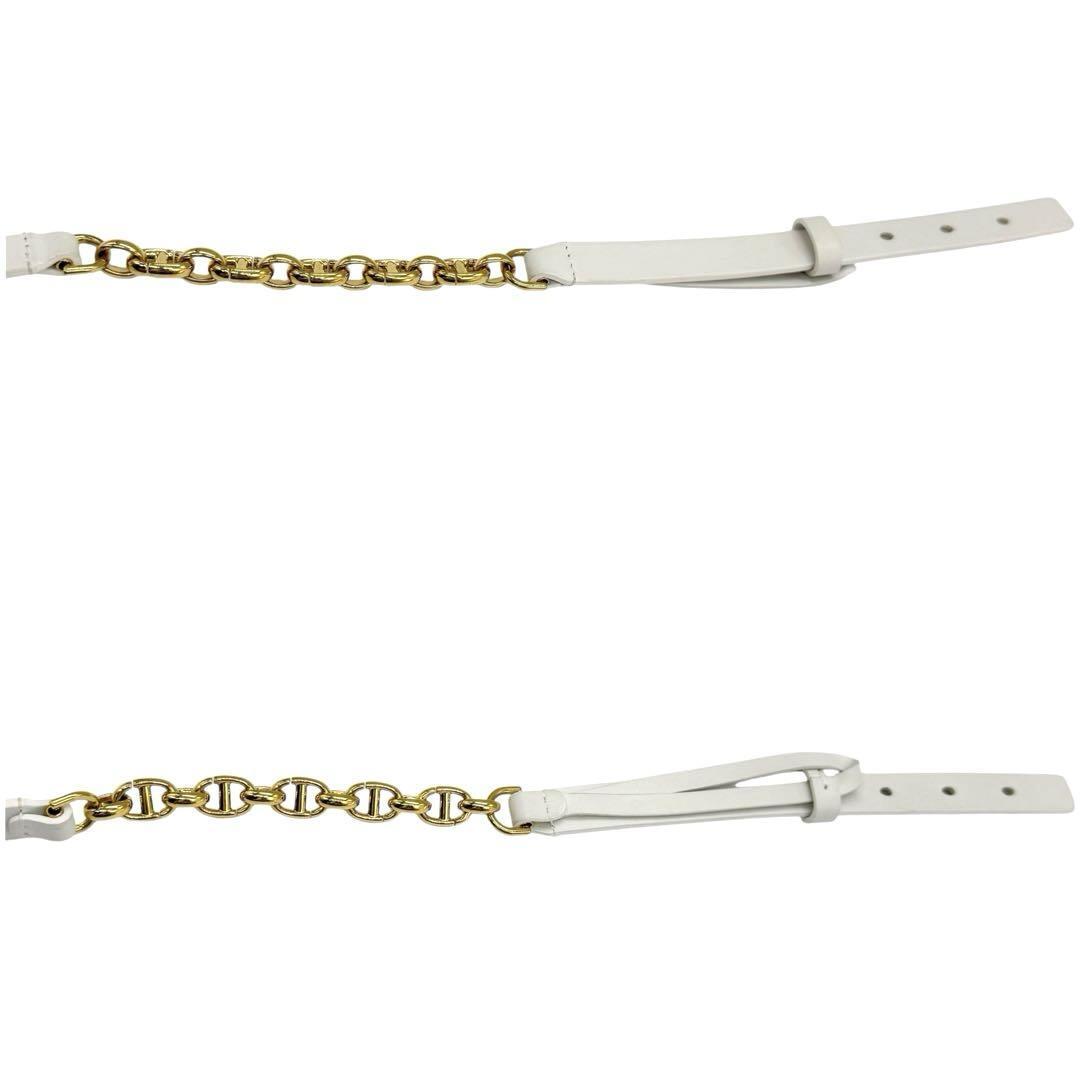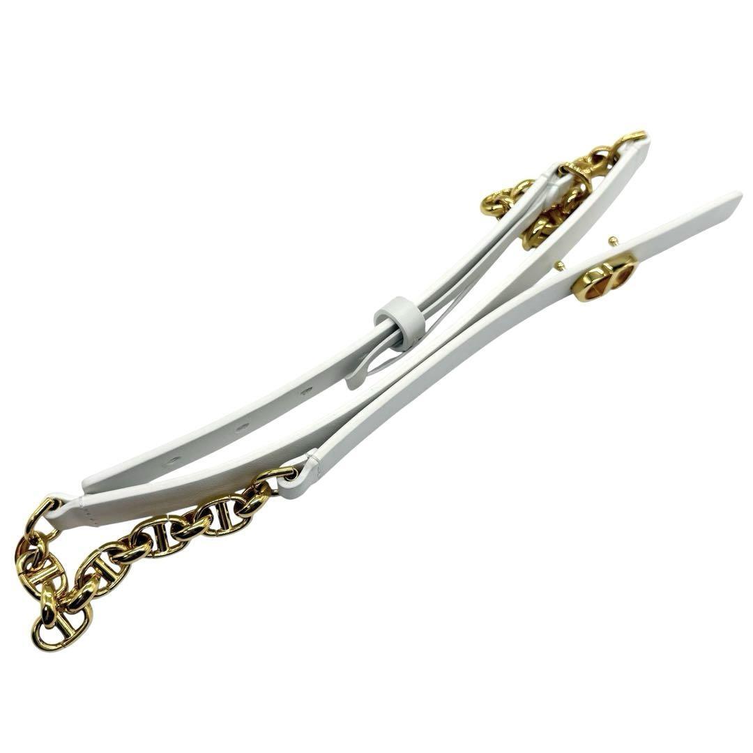 光沢のあるホワイトレザーにゴールドのチェーンが優雅に絡み合い、上品なコントラストを生み出します。