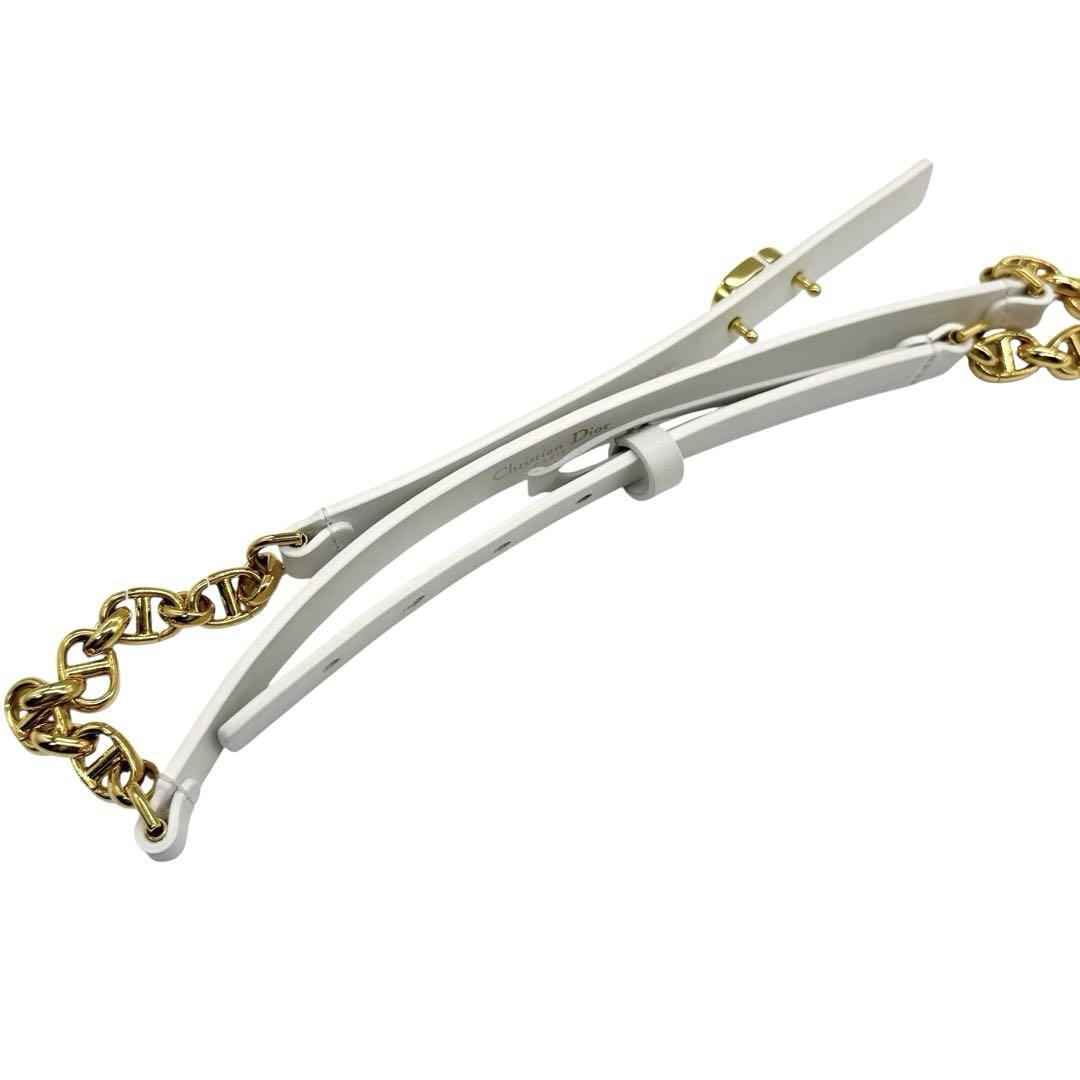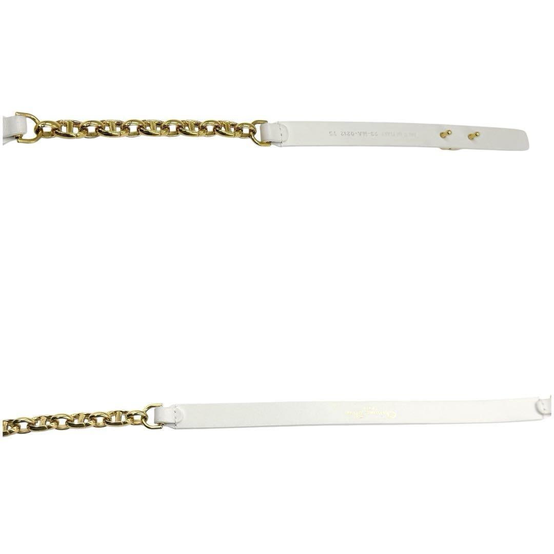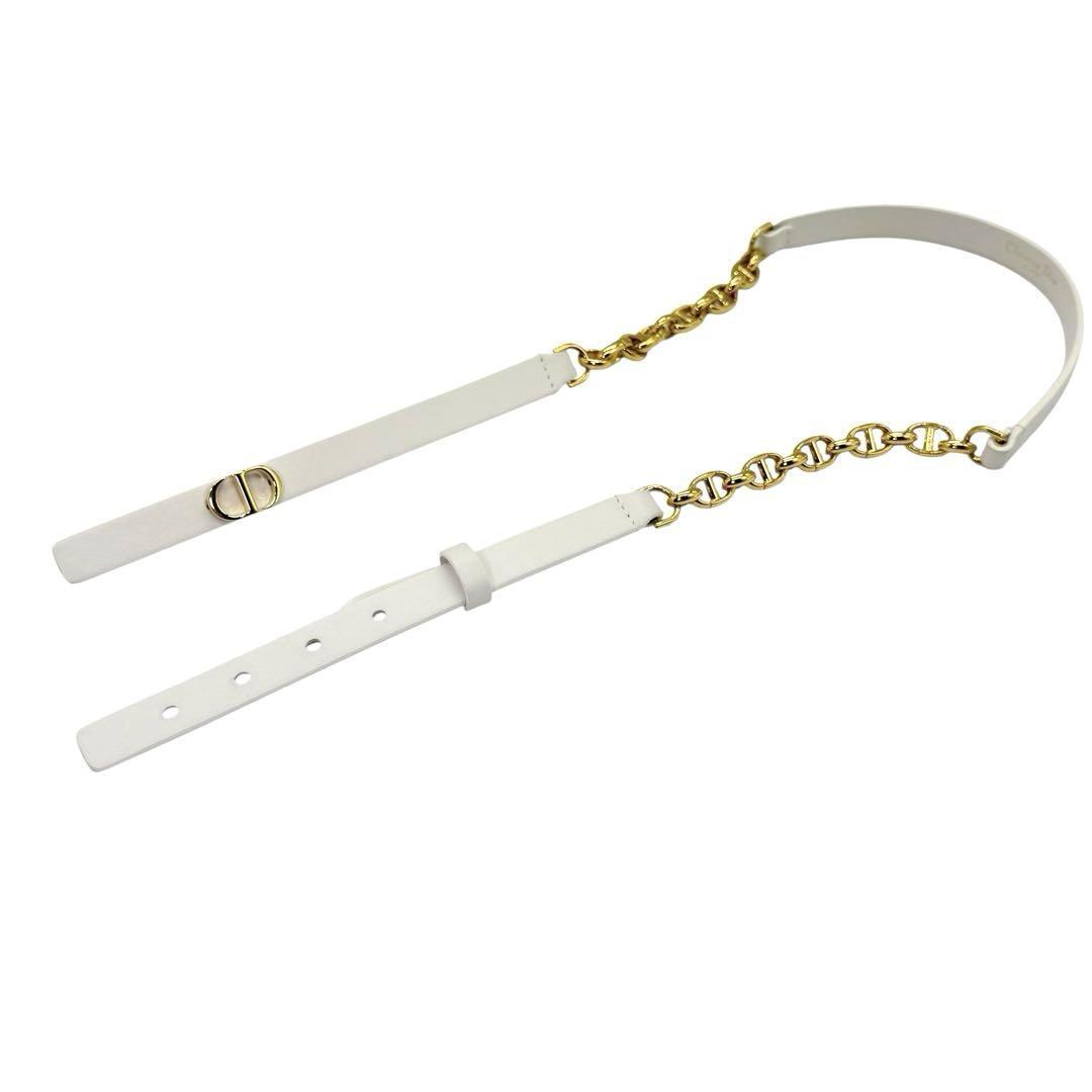 光沢のあるホワイトレザーにゴールドのチェーンが優雅に絡み合い、上品なコントラストを生み出します。