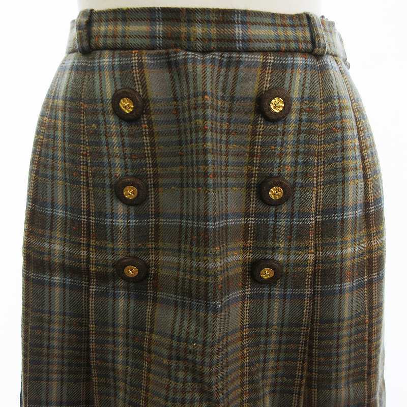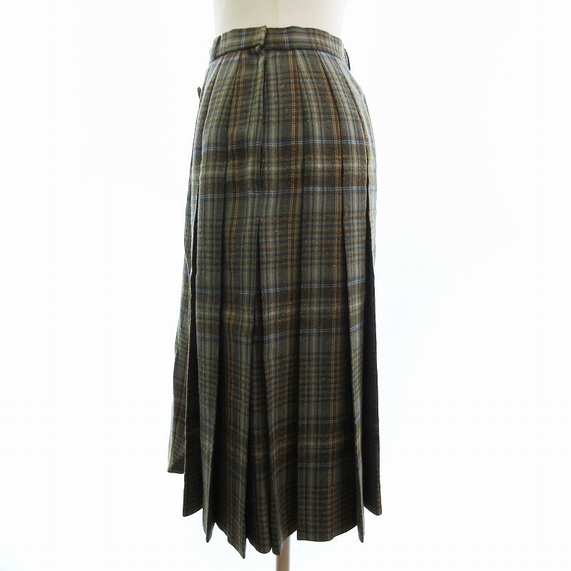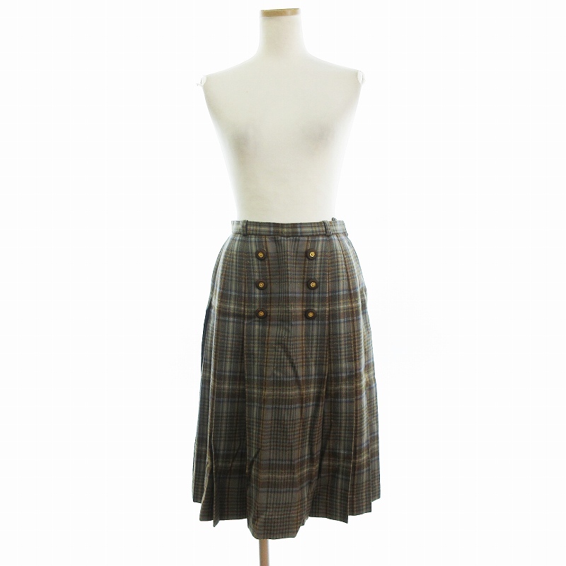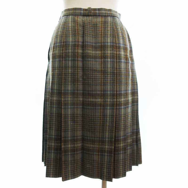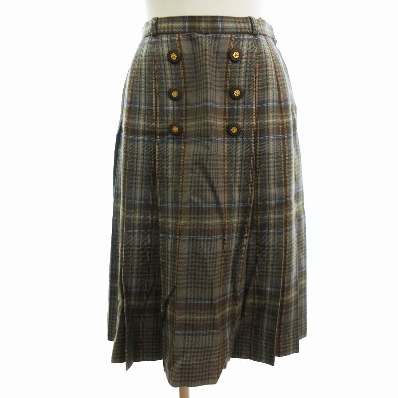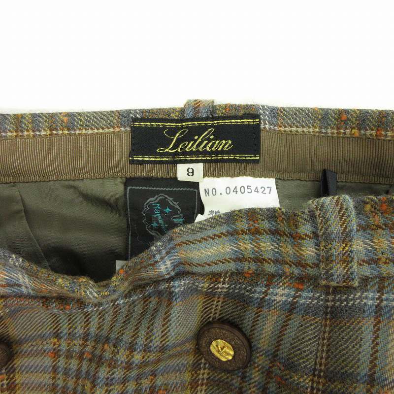 レリアン Leilian プリーツスカート ひざ丈 フレア ボタン ウール チェック 茶 グレー ブラウン 9 レディース