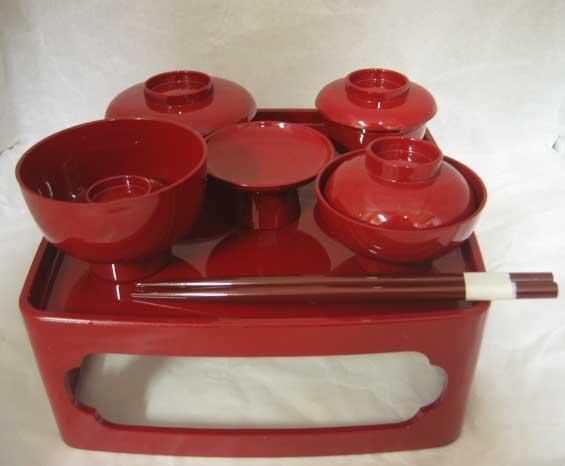 寸法:巾18cm×奥行18cm×高さ7.3cm 6寸 材質:樹脂製 総朱色 椀・箸付