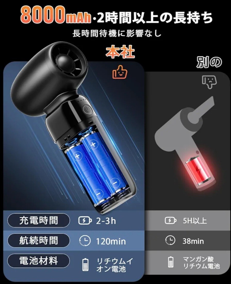【8000mAh大容量バッテリー&Type-C急速充電】2つの高出力バッテリーを搭載し、微風モード時で最大150分の連続使用が可能。Type-C急速充電対応で、外出先でもモバイルバッテリーや車載充電器で手軽に充電可能(より速い充電速度を得るには、5V 2A以上の充電器を使用してください。)。使い捨てエアダスターの空缶処理不要で、安全・エコ・無臭な持続型ソリューション。使用コストを削減、長期的な経済性を実現。