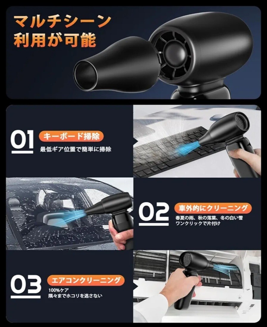 【3段階風量調整&多用途対応】長押し2秒で電源ON後、ボタンクリックで3段階の風量を即時切替。キーボード溝のパンくず、PC内部のホコリ、カメラレンズの微粒子、車内エアコン吹き出し口など、あらゆる狭小スペースに最適。強風モードでは屋外のBBQ炭起こしや洗車後の水切りにも威力を発揮します。